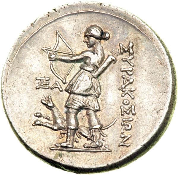 Sicily, Syracuse. Republic, 214-212 BC. AR 12 Litrai (10.14 g). Head left of Athena, wearing crested Corinthian helmet ornamented with snake. Reverse: Artemis standing left, discharging arrow from bow; at her feet, hound running left. SNG Cop 878; SNG ANS 1040. Extremely Fine.