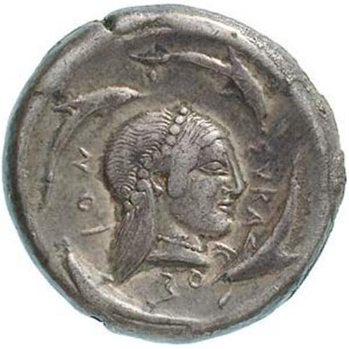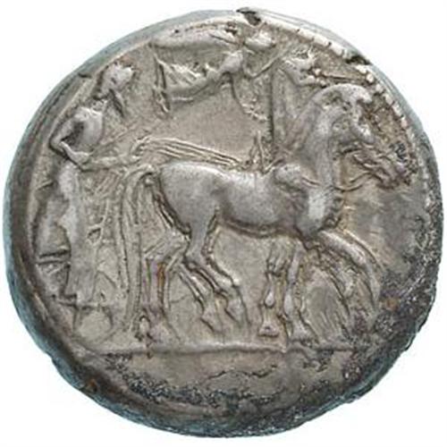 Greek Coins. Sicilia. Siracusa. Tetradrachm, 485-479 a.C. D/ Quadriga al passo a destra, condotta da un auriga. Sopra, Nike vola a destra e incorona i cavalli. R/ SVRAKOS???. Testa di Aretusa a destra. Intorno, quattro delfini. Boeh. 144. gr. 17.24 R. AG. Bel BB+.