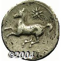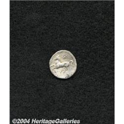 <B>Sicily, Syracuse. Time of Timoleon.</B></I> 345-317 B.C. AR 2 litrae (14 mm, 1.53 g). Janiform female head; dolphin in right field / Horse galloping left; star above. SNG ANS 517. Nice VF, porosity. <BR><BR><B>Important notice:</B> Heritage usually auctions material at the rate of 200-250 lots per hour. On some occasions eBay Live bid software or the Internet may not be able to keep up with the pace of the auction. We recommend placing a realistic absentee bid now as insurance to avoid disappointment. Occasionally the auctioneer may eliminate or reject an eBay Live bid, and the auctioneer may also reopen a lot after the close of the eBay live bidding (usually because we missed an audience bid), and may reject your bid even if it shows you as the winning bidder. By bidding via eBay Live, you agree that Heritage may award the lot to another bidder at its sole discretion under the circumstances described above or any other reasonable circumstances. Since eBay bids are not shown to us until we open the lot on the floor, we treat those bids just like floor bids. In most cases the floor responds before the eBay bid is presented to us, due to Internet lag time, so for consistency we have made it a policy that floor bids are always considered first over tie eBay live bids. Also please note that all Heritage lots purchased through eBay Live carry a 20% Buyer's Premium. Please make sure you read the Terms and Conditions before you bid.