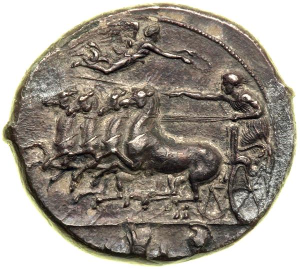 Sicily, Syracuse, c. 405-400 BC. Silver Decadrachm (41.87 g). Unsigned dies in style of Euainetos. Charioteer driving fast quadriga left, holding kentron in right hand, reins in left; Nike flying right above and crowning charioteer; below heavy exergual line, a cuirass, shield, greaves, helmet, and horizontal spear. Reverse: Head of Arethusa left, wearing necklace and single-drop earring, raised dot before neck, surrounded by four dolphins. Gallatin R.XXI I/ J.VIA. Dies of exceptional style, with none of the usual rust. Attractively toned. Unobtrusive die break running across Arethusa's cheek. Superb Extremely Fine.