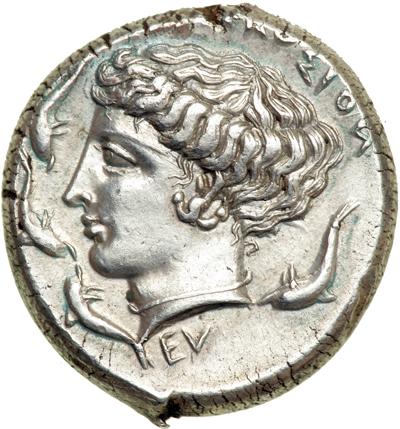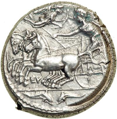 Sicily, Syracuse, c. 415-405 BC. AR Tetradrachm (17.2 g) signed twice by the artist Eumenes. Galloping quadriga driven left by charioteer; above, Nike flying right with branch, crowning charioteer; "EV" in field between horses' legs. Reverse: Head of Arethusa left; around, four dolphins; artist's signature "EV" below. Dewing 842; SNG ANS 256; Rizzo pl. 42, 14. Extremely Fine.