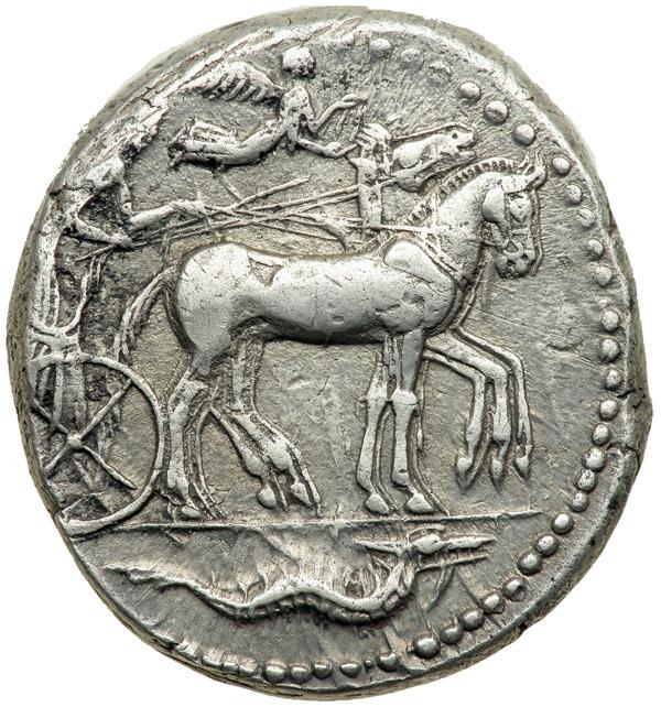 Sicily, Syracuse, c. 460-440 BC. AR Tetradrachm (17.64 g). Quadriga driven at steady pace right by charioteer; above, Nike flying right crowning horses; in exergue, ketos (sea-monster) right. Reverse: Pearl-diademed head right of Arethusa wearing koppa-shaped earring with pendant and beaded necklace; all surrounded by four dolphins swimming clockwise. Boehringer 477; Dewing 790. About Extremely Fine.