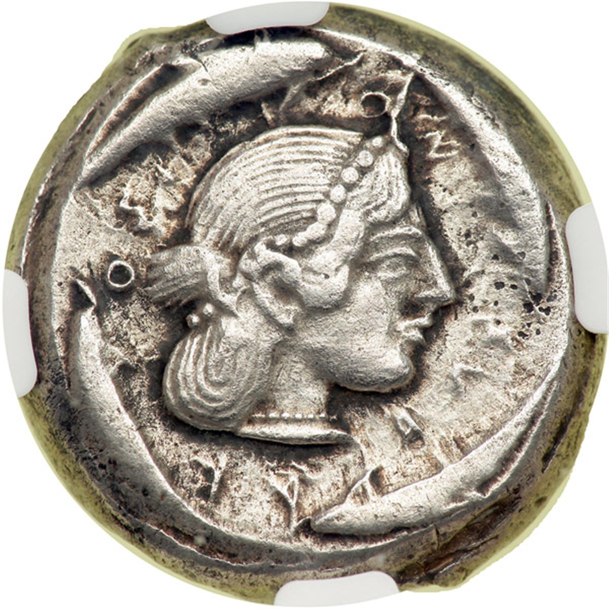 Sicily, Syracuse, c. 480-475 BC. AR Tetradrachm (17.30 g). Quadriga driven at steady pace right by charioteer; above, Nike flying right crowning horses. Reverse: Pearl-diademed head right of Arethusa, wearing beaded necklace, all surrounded by four dolphins swimming clockwise. Boehringer Group 3, 8; cf. SNG ANS 49-77. Small diameter, thick flan, as often seen on the issues of this period. NGC graded Ch VF; Strike 3/5; Surface 3/5.