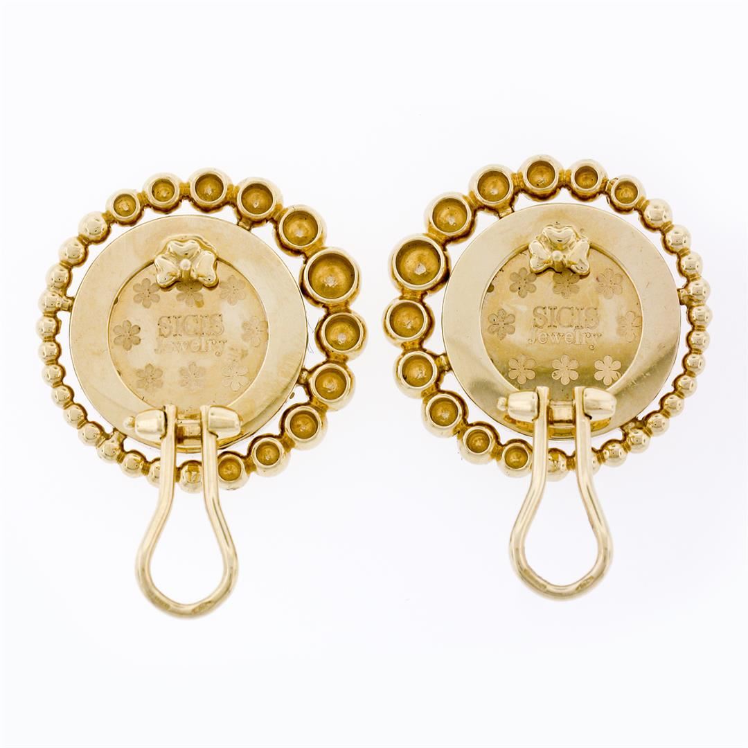An estate solid 18k yellow gold micromosaic strawberry button earrings by Sicis, with 16 round brilliant natural yellow sapphires (0.48ctw). The earrings measure approximately 25.5mm in diameter and weigh a total of 24.26 grams.