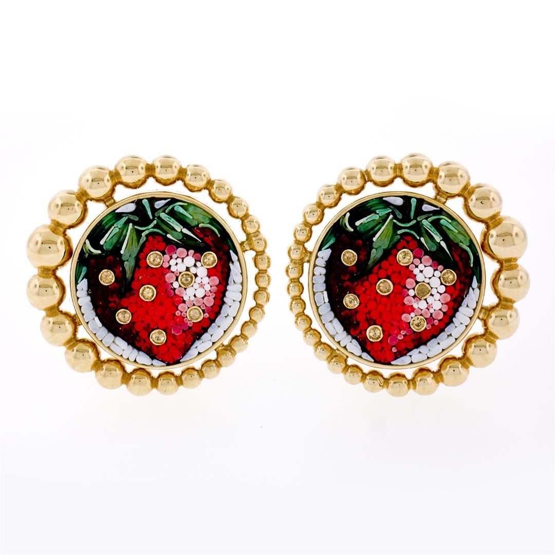 An estate solid 18k yellow gold micromosaic strawberry button earrings by Sicis, with 16 round brilliant natural yellow sapphires (0.48ctw). The earrings measure approximately 25.5mm in diameter and weigh a total of 24.26 grams.