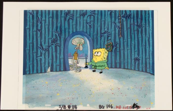 To create production cels, the original animator's drawing is transferred onto an acetate cel (by hand-inking and/or photo copying). The cel is then hand-painted on the reverse side. The printed background is ready to be matted and framed. It is a colored background with a cel and has the animator's notations at the bottom of the background and the cel. The background is a printed reproduction background. The cel has multiple layers; first is Spongebob and the second cel is Squidward.