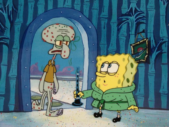 This animation cel and reproduction background are from the Nickelodeon TV show SpongeBob Squarepants. The story takes place under the deep blue sea in Bikini Bottom, where SpongeBob resides. SpongeBob, who is a yellow, porous sponge, is your typical happy-go-lucky character, as he is always cheerful and enjoys making people laugh. Patrick Star, SpongeBob's neighbor who is a starfish, is your average children's show idiot, as he boasts knowing nothing and is often getting himself into ridiculous situations. Between the homes of these two lies the home of the miserable Squidward, a squid, who is known for being grouchy and playing tricks on SpongeBob and Patrick. Both SpongeBob and Squidward work at the Krusty Krab, a fast food business run by the greedy money-loving Mr. Krabs, a crab, the arch rival of the evil, possibly misunderstood, Plankton. Another neighbor, Sandy Cheeks, an athletic squirrel who normally wears an astronaut's space suit, was introduced in "Tea at the Treedome." She spends most of her time inventing and experimenting. Squidward looks very sick!Original Printed Background and Animated Cel Overall Size of Background: 11" x 17" Overall Size of the Cel: 10 1/2" x 12 1/2" Very good condition This is an original hand-painted cel set-up used in the production of an episode of "SpongeBob SquarePants." Each one-of-a-kind set-up represents a slight change in position of the characters. When individually photographed and projected in rapid succession, the images appear to move.