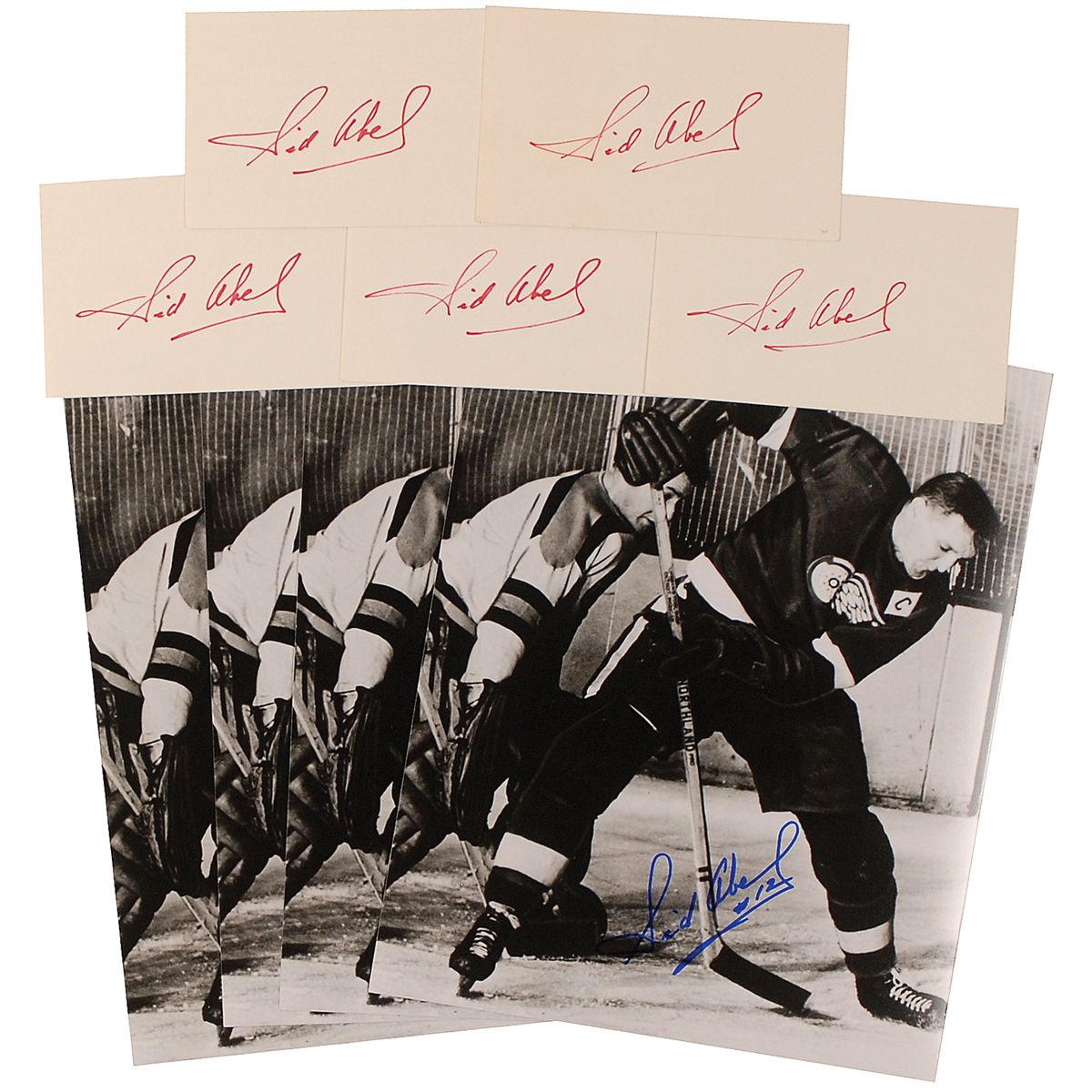 Detroit Red Wings icon and NHL Hall of Famer (1918–2000). Five red felt tip signatures on individual off-white 5 x 3 cards; and four identical satin-finish 8 x 10 photos of Abel on the ice for Detroit, each signed in blue felt tip. In fine condition.