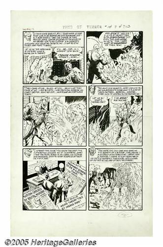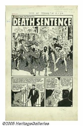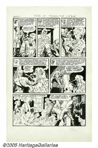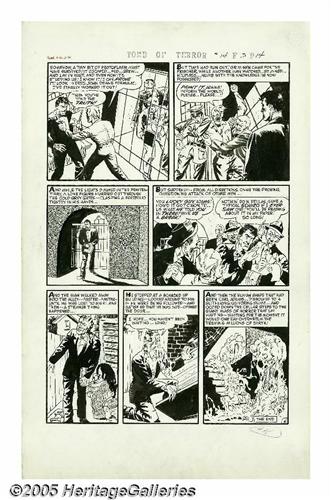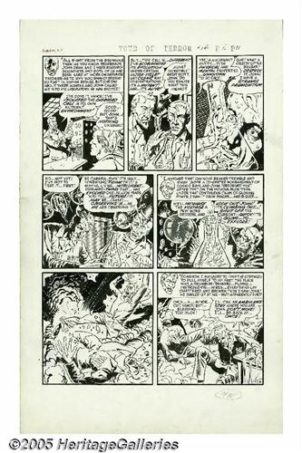 <B>Sid Check - Tomb of Terror #14, Complete 5-page Story "Death Sentence" Original Art (Harvey, 1954).</B></I> This decidedly EC-esque tale will leave you paralyzed with fright, as you watch a hideous science discovery transform a man into a jelly-like mountain of red-gashed flesh. The "weird science" acident makes John Dean grow and evolve, and change his form and life into shapeless"Blob"-like entity. Check's detailed art shows the influence of his friends, Wally Wood and Al Williamson. The pages have an image area of 12" x 18" and are in Excellent condition. This is one of Check's best, so don't miss out!