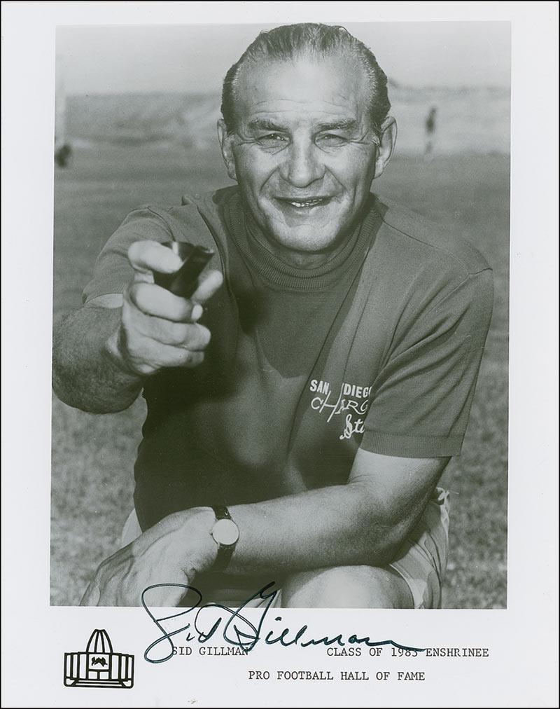 Pro Football Hall of Famer (1911-2003) whose insistence on stretching the football field by throwing deep down field passes, instead of short passes to running backs or wide receivers at the sides of the line of scrimmage, made football into the modern game that it is today. Glossy 8 x 10 Hall of Fame Induction photo, signed in black felt tip. In very fine condition.