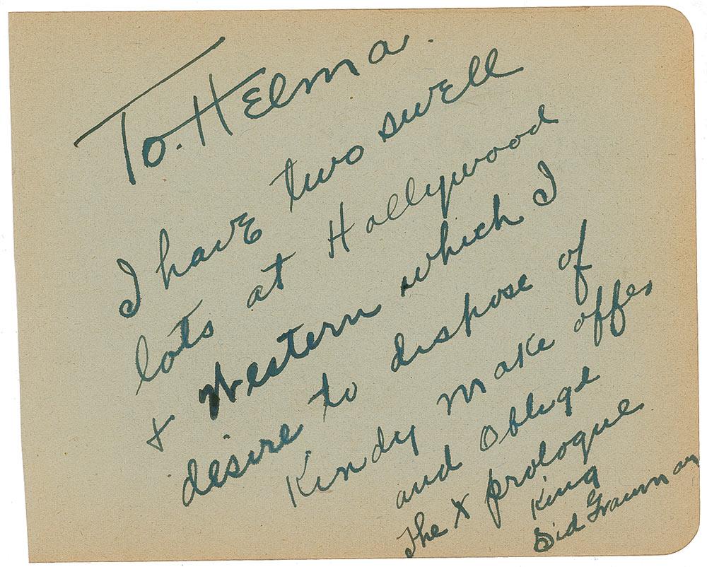 Vintage fountain pen signature and inscription, “To Helena, I have two swell lots at Hollywood & Western which I desire to dispose of. Kindly make offer and oblige. The X Prologue King, Sid Grauman,” on a light green 5.5 x 4.5 album page. In fine condition, with mild toning to edges. Apparently Grauman is eluding to his Chinese theater in this humorous inscription.