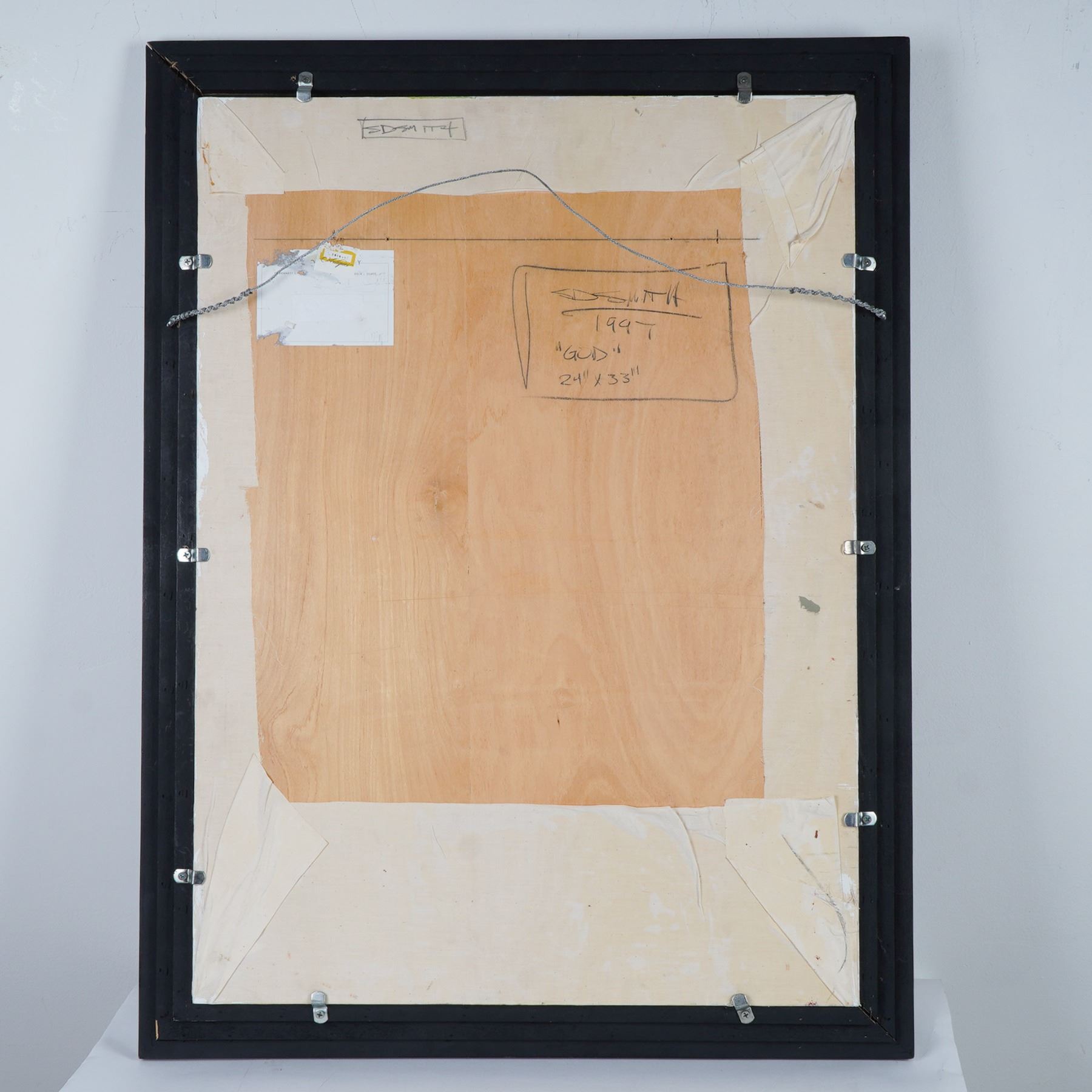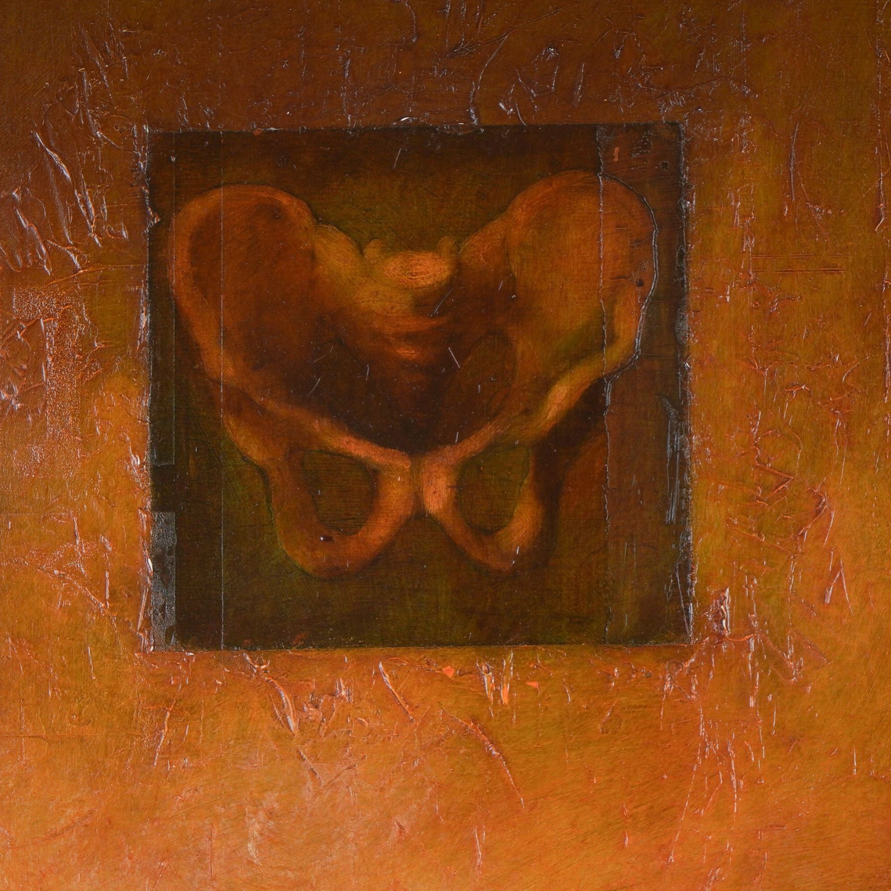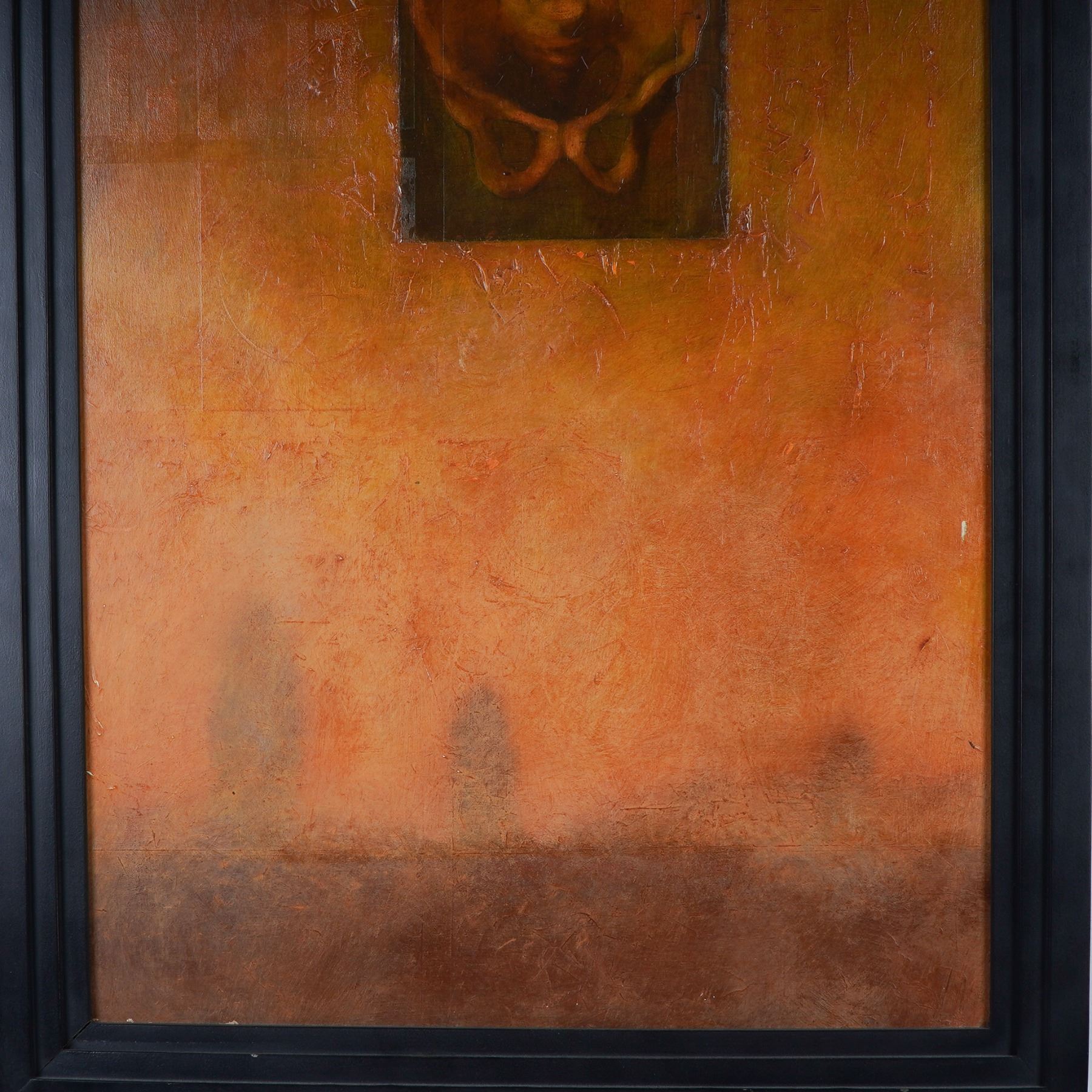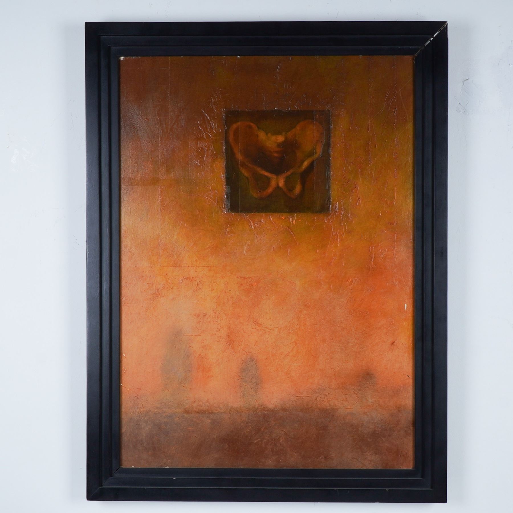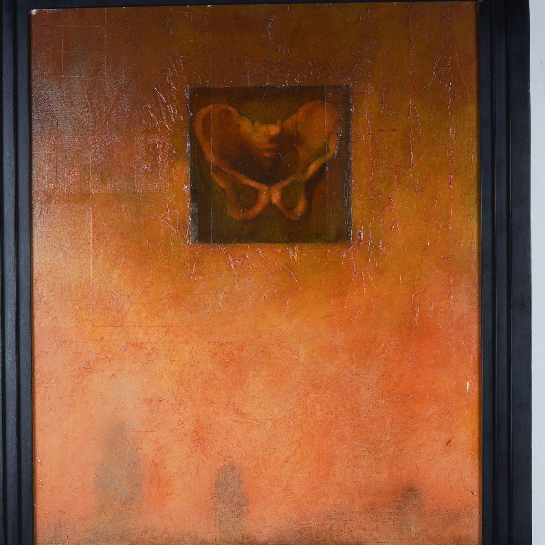 This striking oil on panel titled God by artist Sid Smith presents a haunting yet contemplative image centered on a skeletal pelvis, rendered in a dark square against a richly textured burnt sienna and ochre ground. Dated 1997 and acquired from the Lowe Gallery in Atlanta, the work explores themes of origin, corporeality, and sacred symbolism. The expressive surface treatment enhances the piece's visceral and philosophical depth. A compelling and introspective piece for collectors of contemporary symbolism and modern spiritual expression. Smith is an introspective contemporary artist whose work merges the physicality of form with deeply personal memory and emotional resonance. His practice is rooted in the process of creation, where each mark and structure carries symbolic and psychological weight. Working primarily in painting and sculpture, Smith articulates the intangible - longing, memory, identity - through textured surfaces and anatomical reference points. His work is held in prestigious public and private collections, recognized for its meditative depth and visceral materiality. Signed, titled and dated by the artist on reverse.