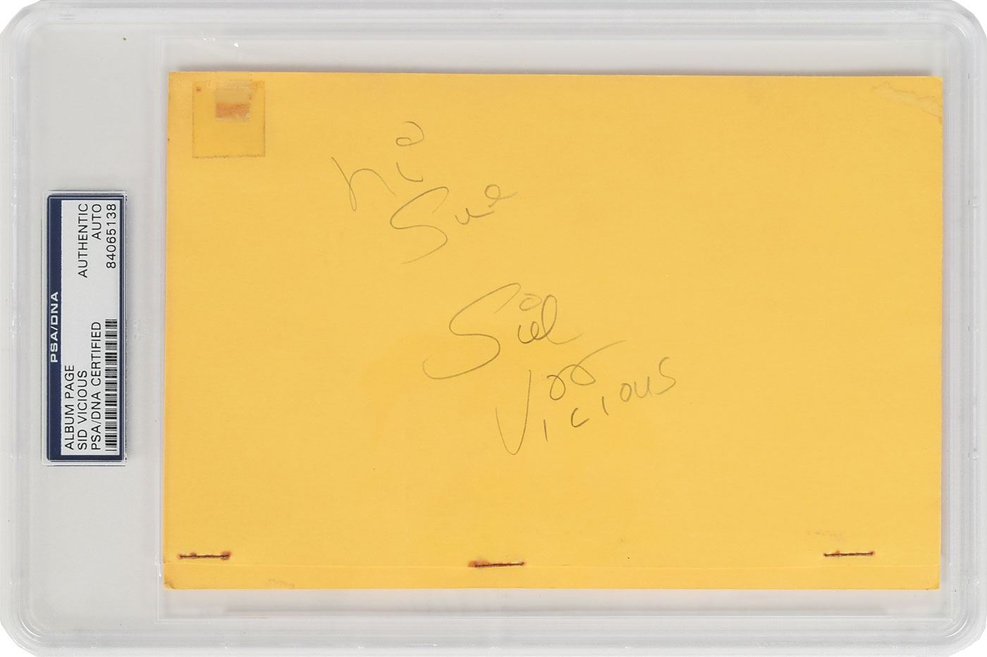 Scarce pencil signature and inscription, "Hi Sue, Sid Vicious,” on a yellow 8 x 5.25 sheet. Encapsulated in a plastic PSA/DNA authentication holder. In fine condition, with three rusty staple marks, a light stain, and some old tape, all far from the handwriting. Vicious, the notorious and short-lived bass player for the Sex Pistols, remains rare across all signed formats. Rare in any format, due to his untimely death at the age of 21.