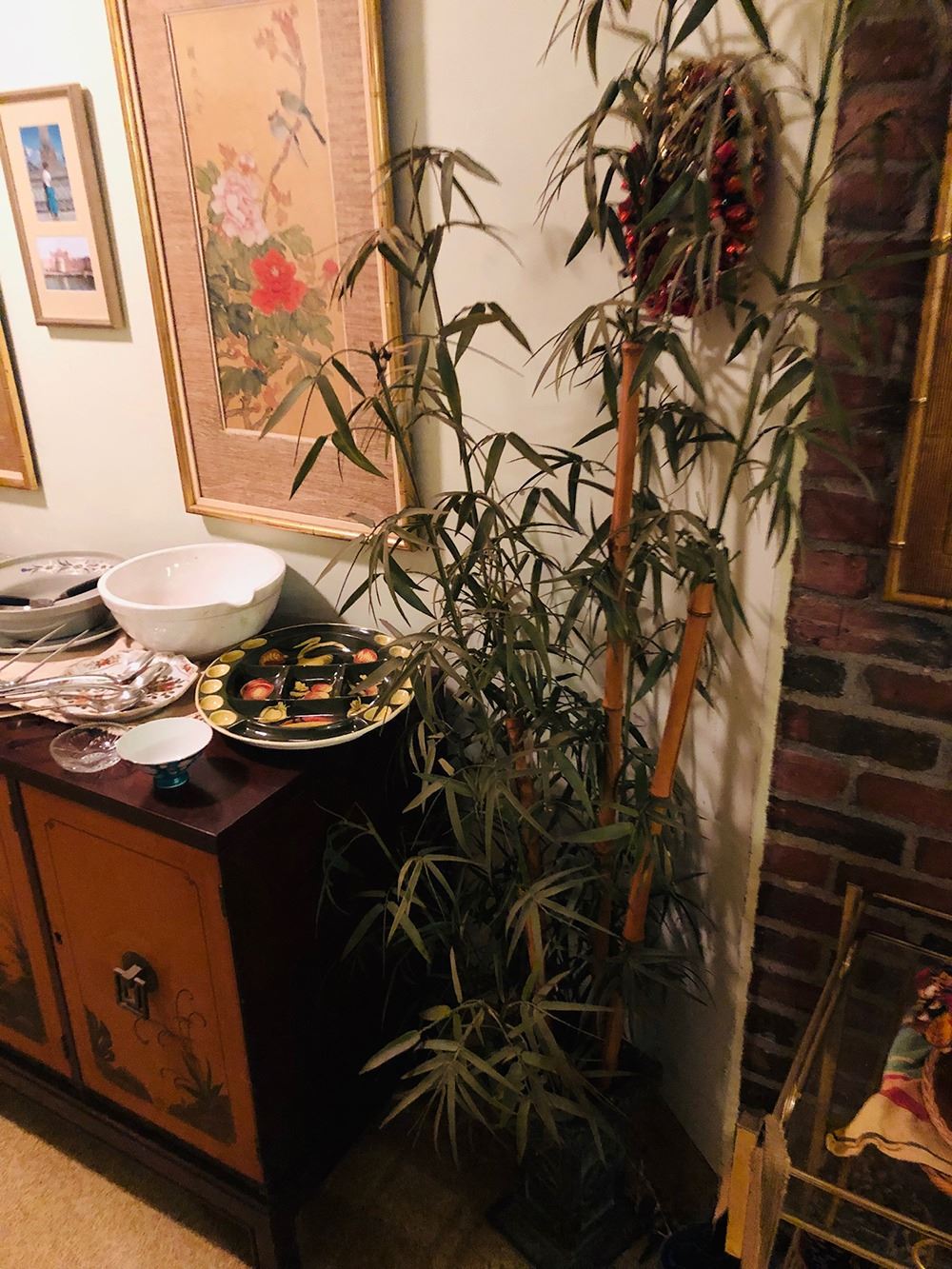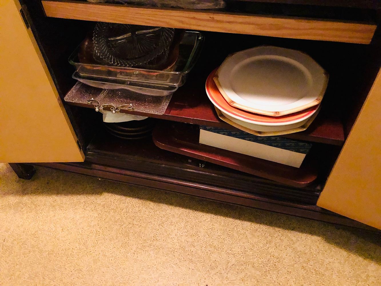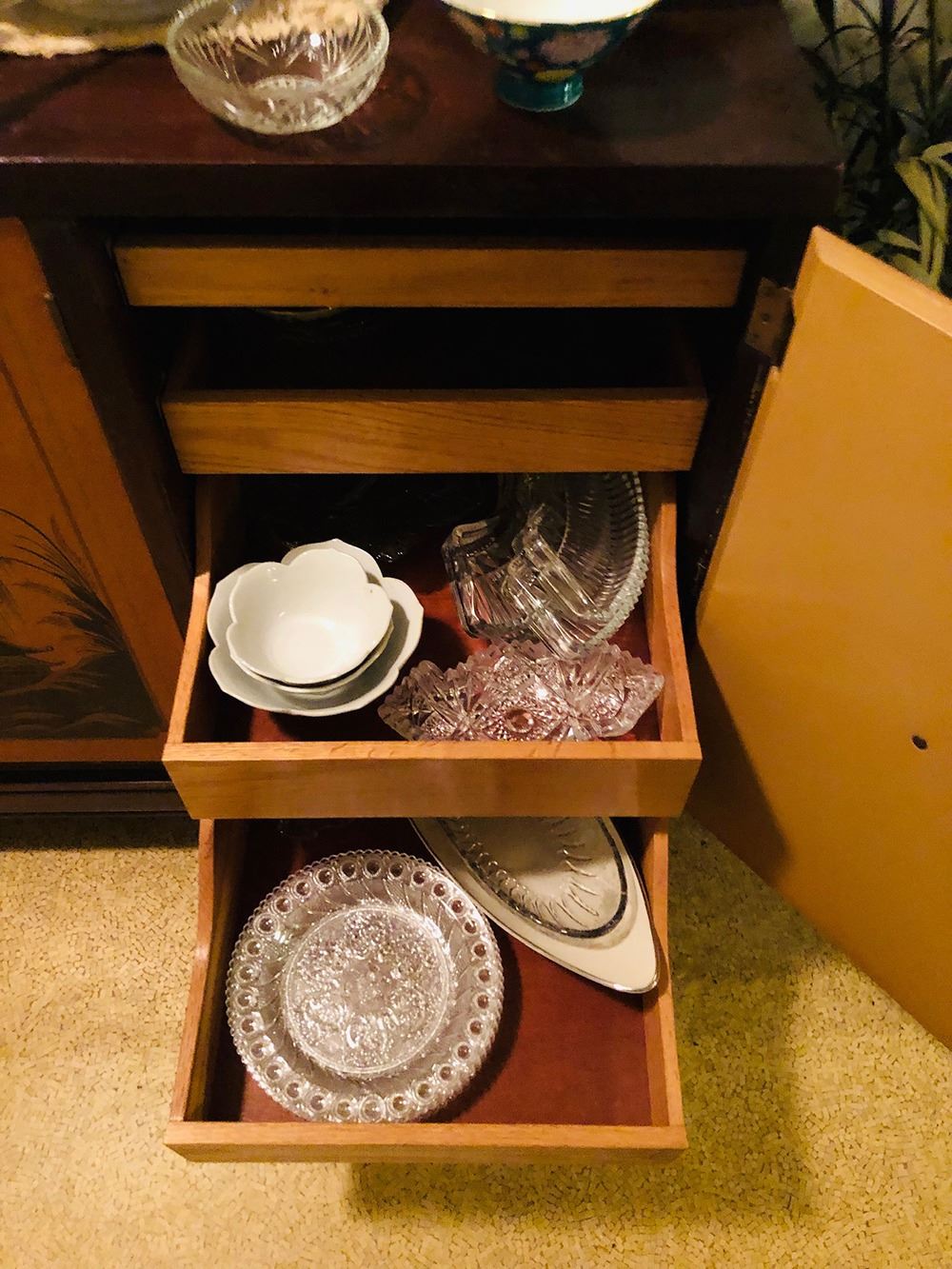 Side Board with Asian motif, made by Johnson Furniture Co., contents including all dishware, serving pieces, bamboo framed Asian artwork, all being sold as found. pd estate