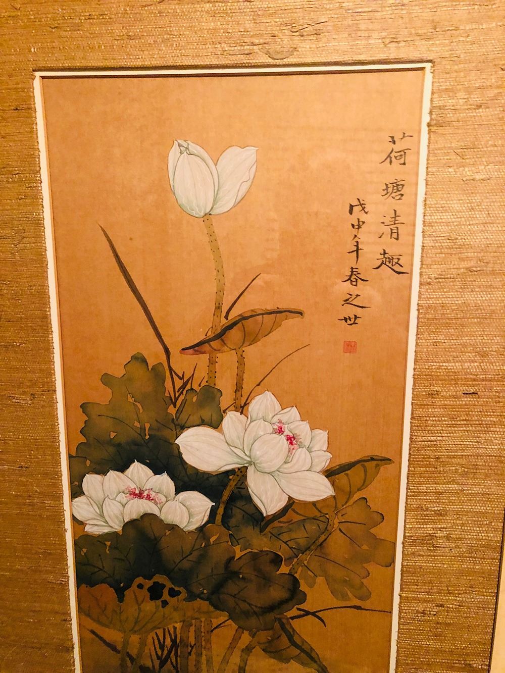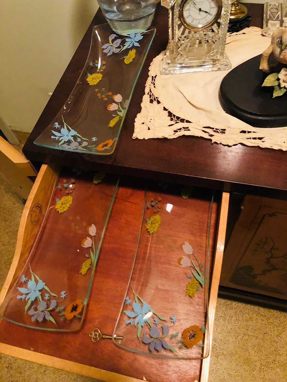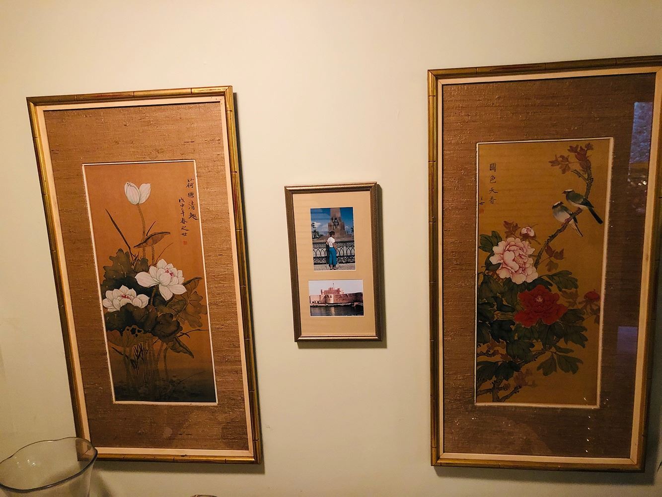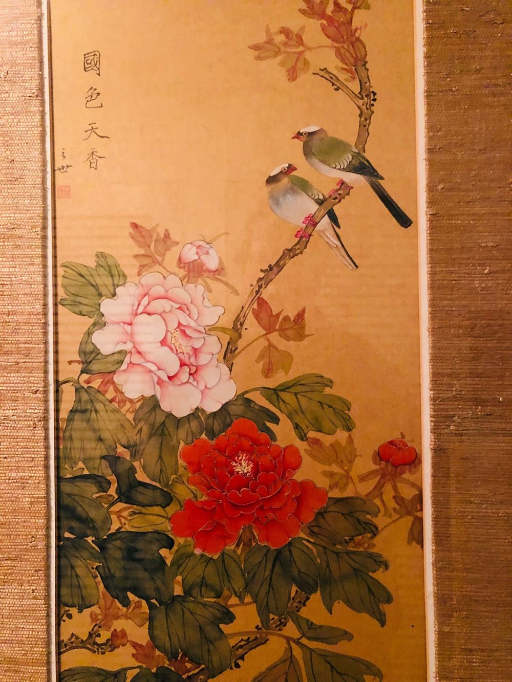 Side Board with Asian motif, made by Johnson Furniture Co., contents including all dishware, serving pieces, bamboo framed Asian artwork, all being sold as found. pd estate