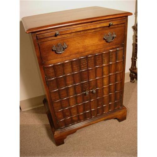 English side chest (Library style) Extendable leather slide. Excellent 'Antique' patina. Cupboard doors with simulated books finish. Drawer with oxidised brass fittings. Bracket feet. Price is for one only. There are two available in stock at this time.