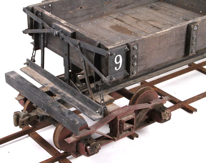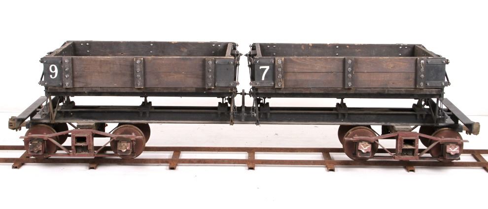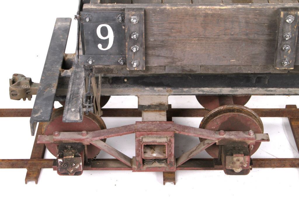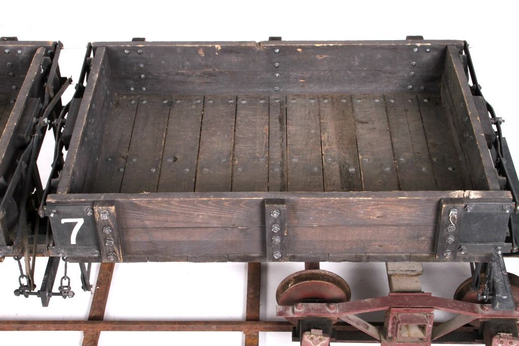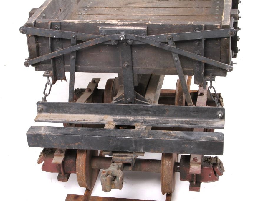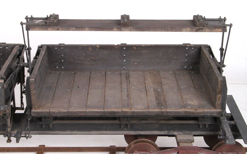 This is a Side Dump Ore Car Live Steam Railroad 7.5" Gauge. The piece shows the larger trucks with each side door having a mechanism that allows it to slide up as shown. The flat bed is believed to also tip to one side or the other for dumping. This is a great Mining Ore Railroad piece. The car appears to be complete and has couplers on each end. This is from the James Edgerley OR&W Ride-On Railroad that operated in Bozeman, Montana. Measures 73.5"L x 16.25"H x 20.25"W. Track Not Included.