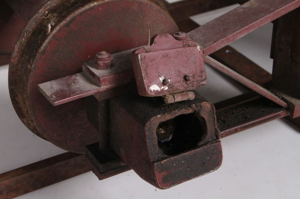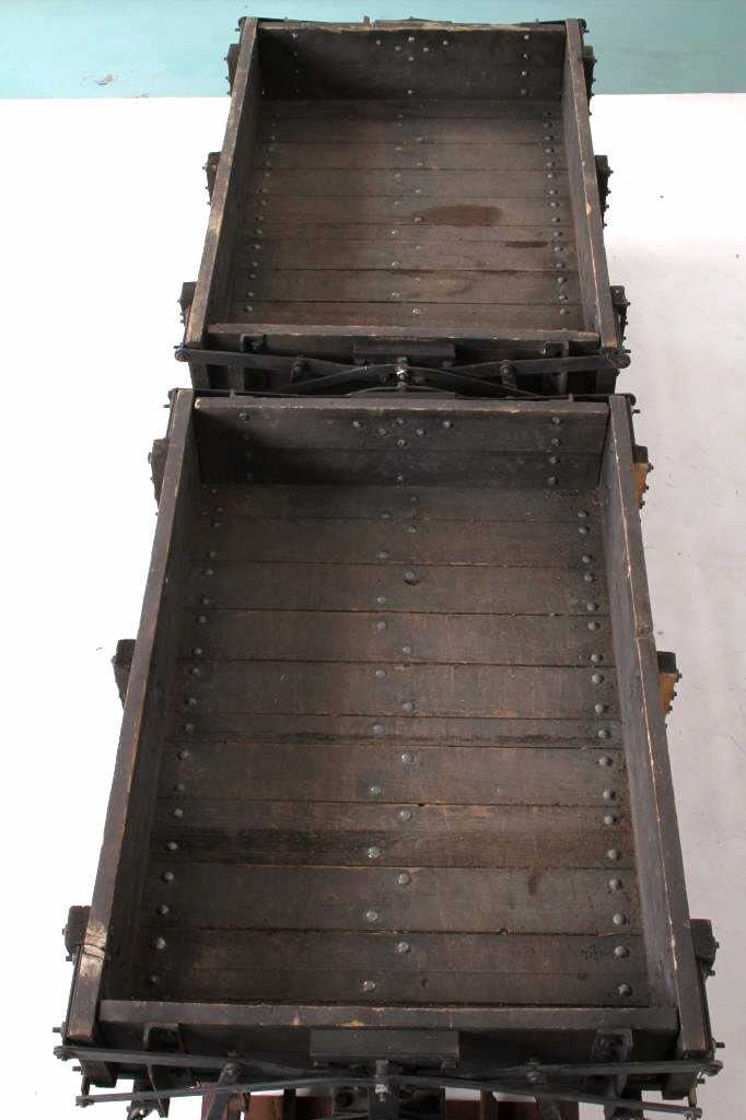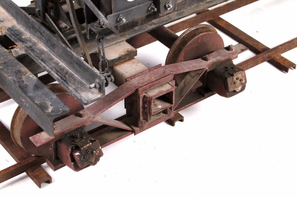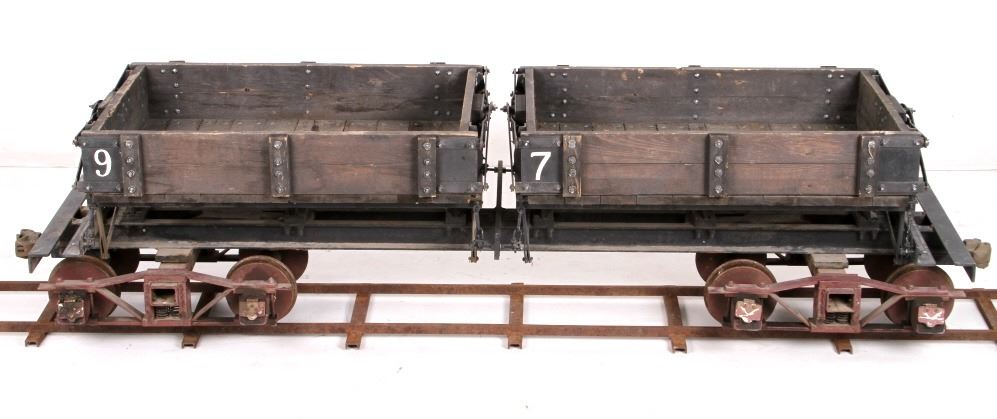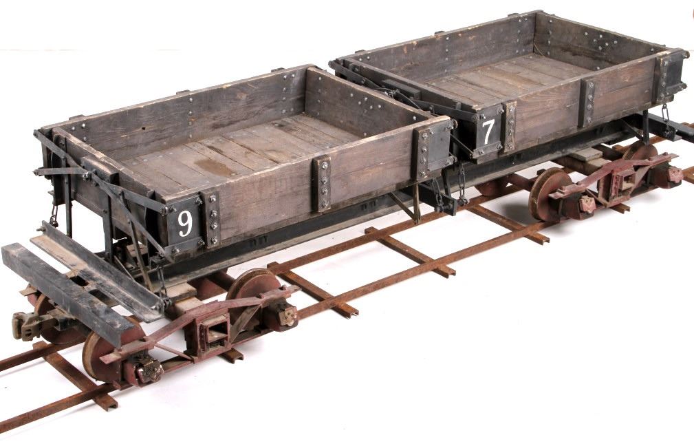 This is a Side Dump Ore Car Live Steam Railroad 7.5" Gauge. The piece shows the larger trucks with each side door having a mechanism that allows it to slide up as shown. The flat bed is believed to also tip to one side or the other for dumping. This is a great Mining Ore Railroad piece. The car appears to be complete and has couplers on each end. This is from the James Edgerley OR&W Ride-On Railroad that operated in Bozeman, Montana. Measures 73.5"L x 16.25"H x 20.25"W. Track Not Included.