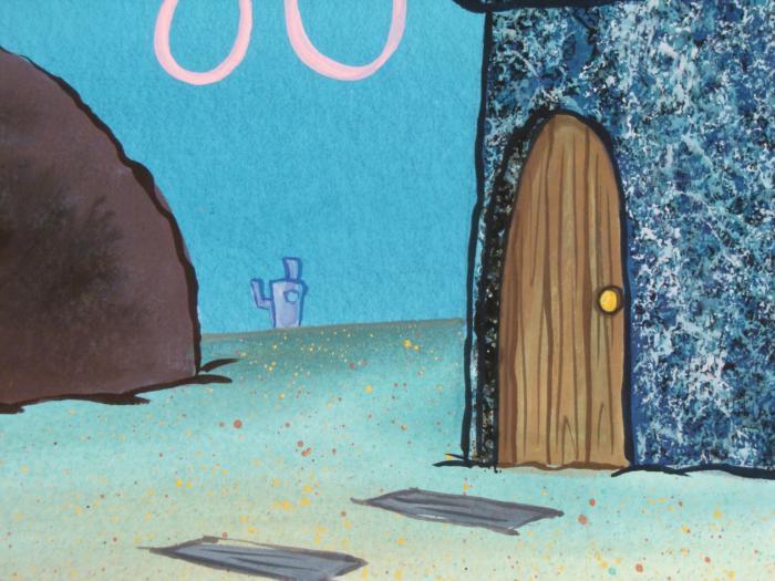 This original hand-painted background from the Nickelodeon TV show SpongeBob Squarepants. The story takes place under the deep blue sea in Bikini Bottom, where SpongeBob resides. SpongeBob, who is a yellow, porous sponge, is your typical happy-go-lucky character, as he is always cheerful and enjoys making people laugh. Patrick Star, SpongeBob's neighbor who is a starfish, is your average children's show idiot, as he boasts knowing nothing and is often getting himself into ridiculous situations. Between the homes of these two lies the home of the miserable Squidward, a squid, who is known for being grouchy and playing tricks on SpongeBob and Patrick. Both SpongeBob and Squidward work at the Krusty Krab, a fast food business run by the greedy money-loving Mr. Krabs, a crab, the arch rival of the evil, possibly misunderstood, Plankton. Another neighbor, Sandy Cheeks, an athletic squirrel who normally wears an astronaut's space suit, was introduced in "Tea at the Treedome." She spends most of her time inventing and experimenting. This is a side view of Squidward's house.Original Production Background Overall Size of Background: 10" x 12 3/4" Very good conditionOriginal Production Backgrounds are used in the making of the final version of animated productions. The background establishes the location and the overall good mood of the scenee. Typically, a background layout artist creates a drawing to establish the content of the scene, placement of characters, perspective and camera angle. Based on this drawing, the background artist creates a preliminary painting to confirm all of the scenes details, then the final production background which is used in the filming of the scene. When these backgrounds are individually photographed behind the progression of production cels, and projected at a rapid succession, the images in the foreground appear to move, creating an animated scene. The background is ready to be matted and framed. It is a colored background with the animator's notations at the bottom.