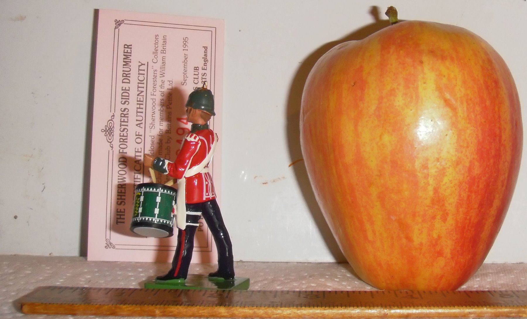 Very interesting Side Drummer, great toy also like number 121W close-up, limited edition, with certificate and box, 1994 Special Collectors Edition for the William Britain Collectors Club Toy Soldiers; this "Side Drummer" is part of the Sherwood Foresters collection and catalogue no. 5937; great as Made in England, for collectors rare items ; measures about 3 inches high; rare and hard to find and a wonderful addition for your collection, as in, in mint condition, for your toy collection now !!!