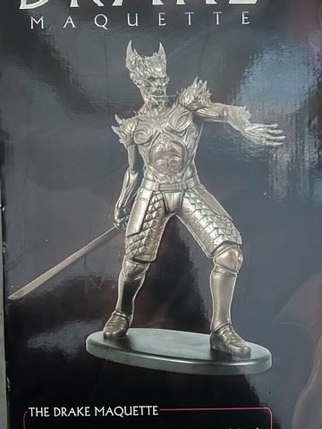 Sculpt: The maquette captures the final, demonic, armored form of Drake. The detail is complex, showing jagged horns, a skeletal face, and intricate, scaled armor plates across his body. He is posed mid-stride, holding a long katana-style sword. The statue has a unique, aged metallic finish (bronze or pewter color) that highlights all the sculpted textures.