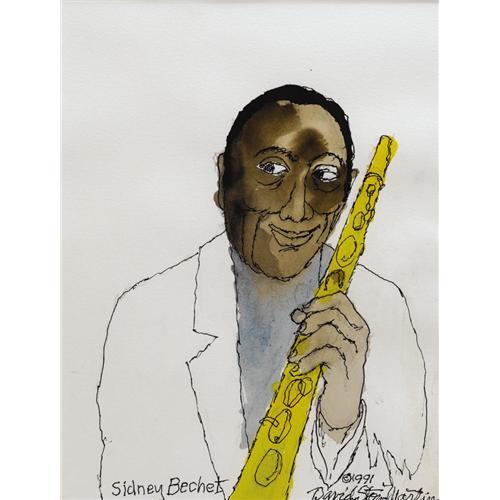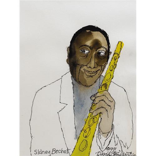 <B>Sidney Bechet Watercolor Portrait.</B></I> An original watercolor portrait of Sidney Bechet by David Stone Martin, 1991. In Excellent condition, framed to an overall size of 20" x 24".