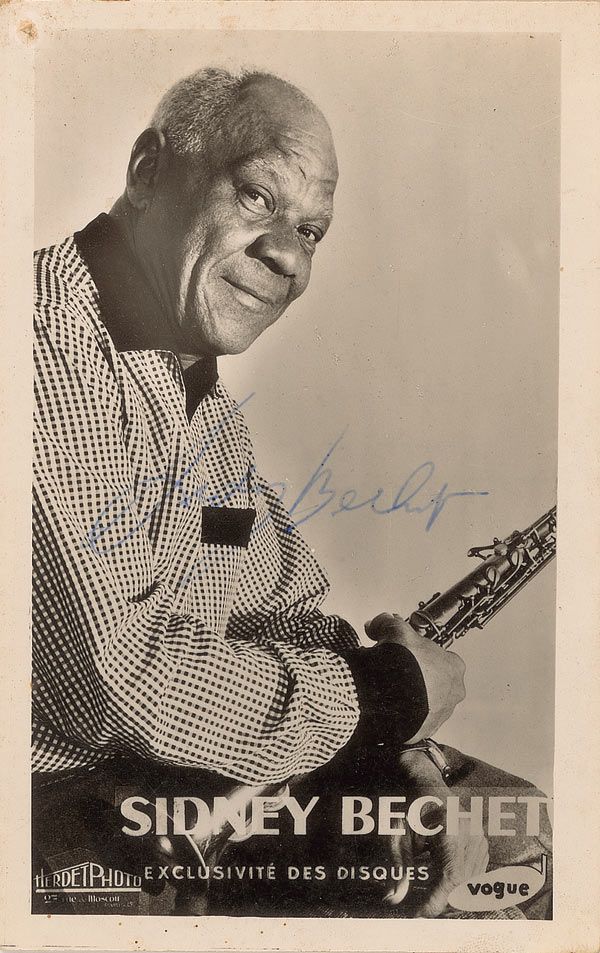 Innovative clarinetist and saxophonist (1897–1959) regarded as one of the greatest wind players in the history of jazz. Vintage 3.5 x 5.5 postcard photo, signed in blue ink. In very good condition, with scattered rubbing to finish, some mild soiling and foxing, and some light contrast to signature, which is a couple of shades light, but completely legible.