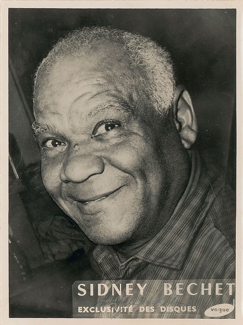 Innovative clarinetist and saxophonist (1897–1959) regarded as one of the greatest wind players in the history of jazz. Glossy 7 x 9.25 publicity photo, signed along the bottom of the image in blue ballpoint. In very good condition, with moderate to heavy contrast to signature and some scattered light creases and surface marks.