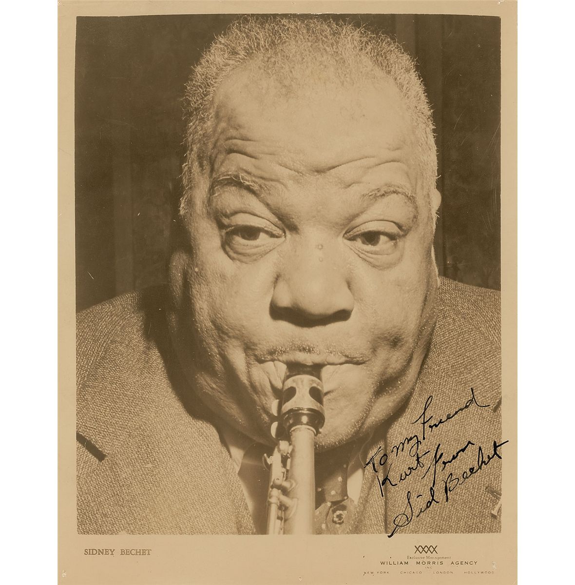Innovative clarinetist and saxophonist (1897–1959) regarded as one of the greatest wind players in the history of jazz. Vintage glossy 8 x 10 William Morris Agency publicity photo of Bechet playing his saxophone, boldly signed and inscribed in fountain pen, “To my friend Kurt, From Sid Bechet.” Moderate overall creases and tack holes to borders, otherwise fine condition.