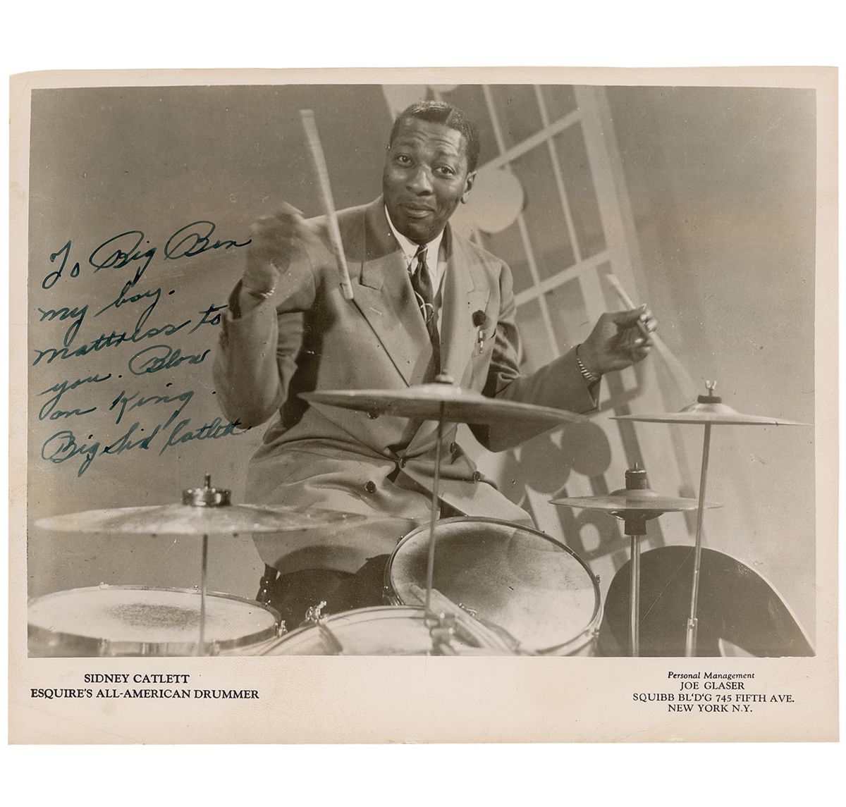 Jazz drummer (1910–1951) who worked with Charlie Parker, Benny Goodman, and Dizzy Gillespie among others. Vintage glossy 10 x 8 publicity photo of Catlett behind his drum kit, signed and inscribed in fountain pen “To Big Ben, my boy—mattress to you. Blow on King. Big Sid Catlett.” In very good condition, with scattered creases and surface marks including a central horizontal crease, light toning and soiling to borders, and a small ding to top left corner. Consignor notes that the photo is inscribed to the great tenor saxist Ben Webster and originates from the Webster estate.