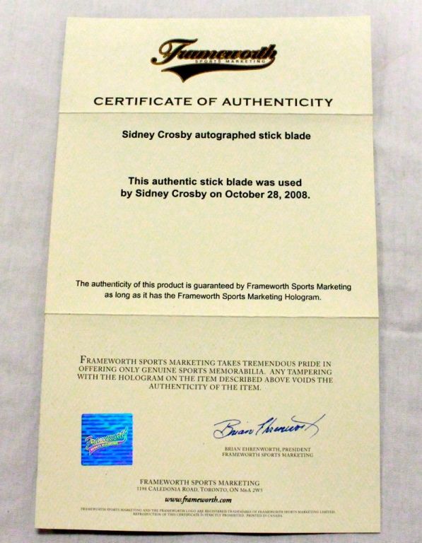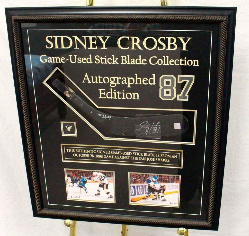 Sidney Crosby Hand Signed Framed Game Used Stick Blade with Certificate of Authenticity. Used on Oct. 8, 2008 VS. The San Jose Sharks.