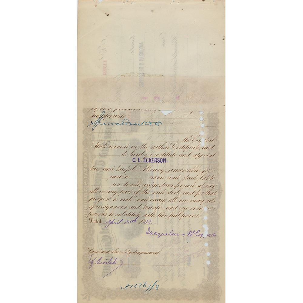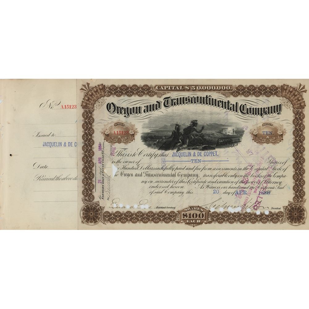 One of America's premier railroad builders (1812–1892) who was involved with the construction of the Union Pacific Railroad and First Transcontinental Railroad. Partly-printed DS, one page, 10.75 x 7, April 20, 1888. Stock certificate issued to Jacqueline & De Coppet for ten shares in the Oregon and Transcontinental Company, signed at the conclusion in ink by Sidney Dillon as president. The original receipt remains affixed to the left side. In fine condition, with cancellation holes affecting the signature.