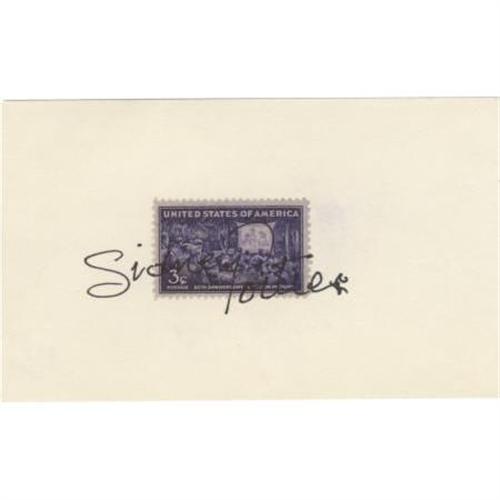 <B>Sidney Poitier Autograph.</B></I> A 5" x 3" card, with a commemorative three-cent postage stamp affixed, signed by the Oscar-winning star of <I>The Defiant Ones</B></I> in blue ink. Poitier's signature spans across the face of the stamp and is large and clean. In Excellent condition.<BR><BR><b>Shipping:</b> Flat Material, Small (<a target="_blank" href="http://www.heritageauctions.com/common/shipping.php">view shipping information</a>)