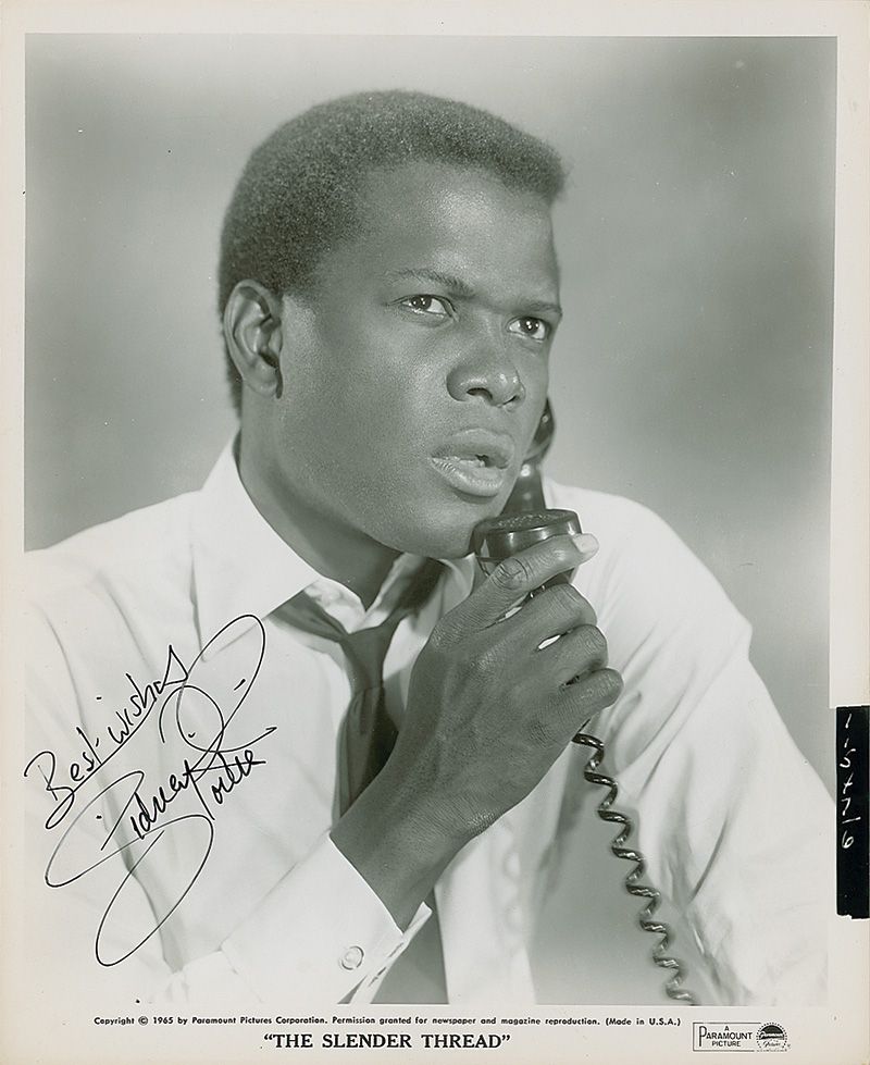 Glossy 8 x 10 Paramount promotional photo of Poitier in The Slender Thread, signed in black felt tip, “Best wishes, Sidney Poitier.” A few scattered light creases, and scattered surface spotting and impressions, otherwise fine condition.