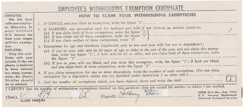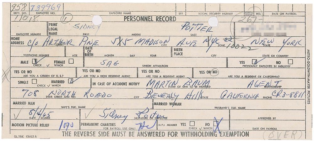 DS, one page both sides, 7.25 x 3.25, August 4, 1965. MGM Pictures W4 tax document, with personal information printed in blue ballpoint by Poitier, including his name, address, and union affiliation, and signed twice, once on the front and once on the reverse. Expected filing and staple holes at the top, and ballpoint and pencil office notations, otherwise fine condition.