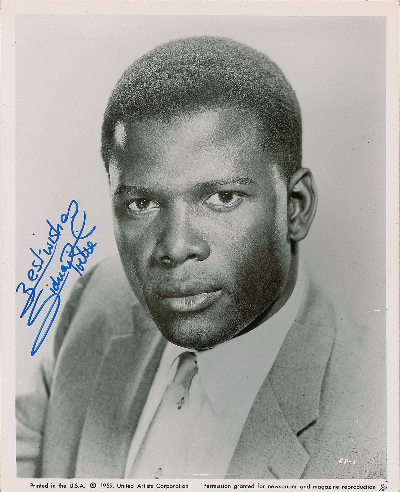 Glossy 8 x 10 publicity photo of a young Poitier in 1959, neatly signed in blue felt tip, "Best wishes, Sidney Poitier." In fine condition. From the Harvey and Rhoda Kuflik Collection.