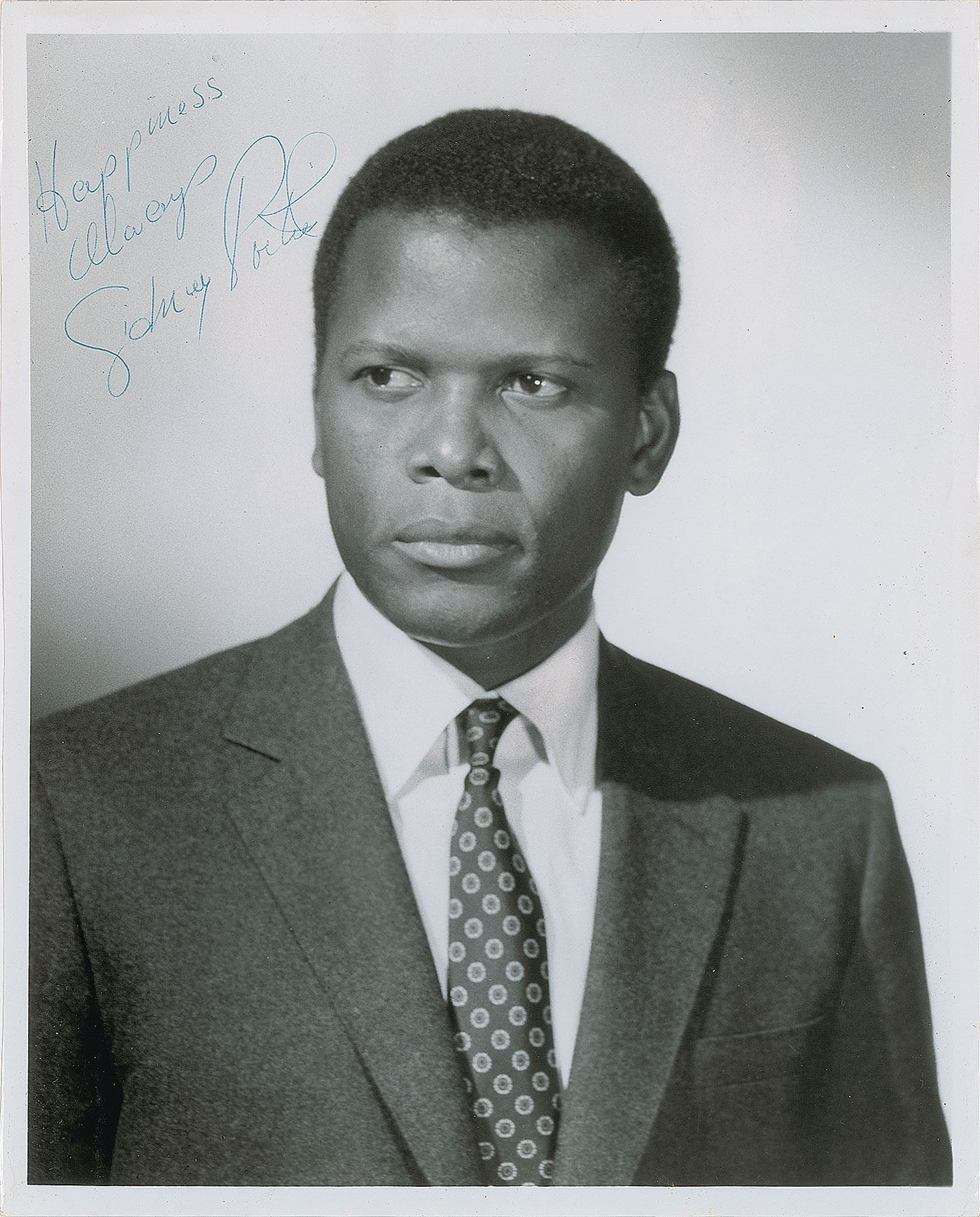 Glossy 8 x 10 head-and-shoulders photo of Poitier in a suit and tie, signed in blue ballpoint, "Happiness always, Sidney Poitier." In fine condition, with some random light emulsion scuffing.