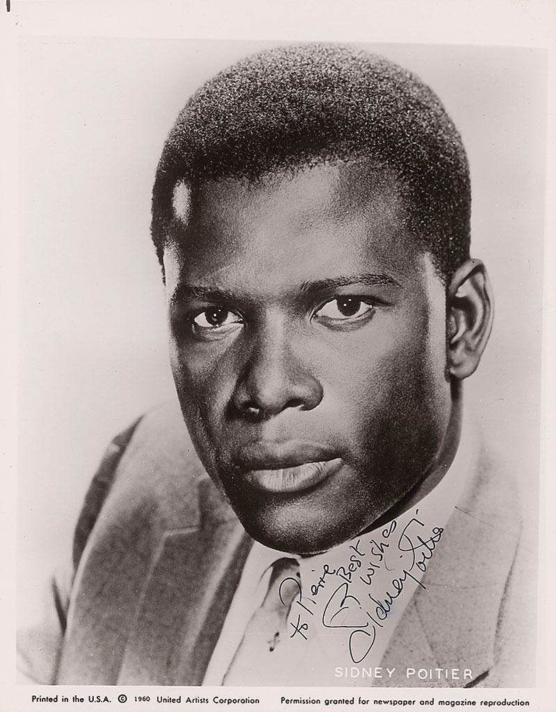 Glossy 8 x 10 United Artists publicity photo of Poitier, signed and inscribed in person in black ink, “To Pierre, Best wishes, Sidney Poitier.” In fine condition, with some light brushing to portions of signature and inscription.