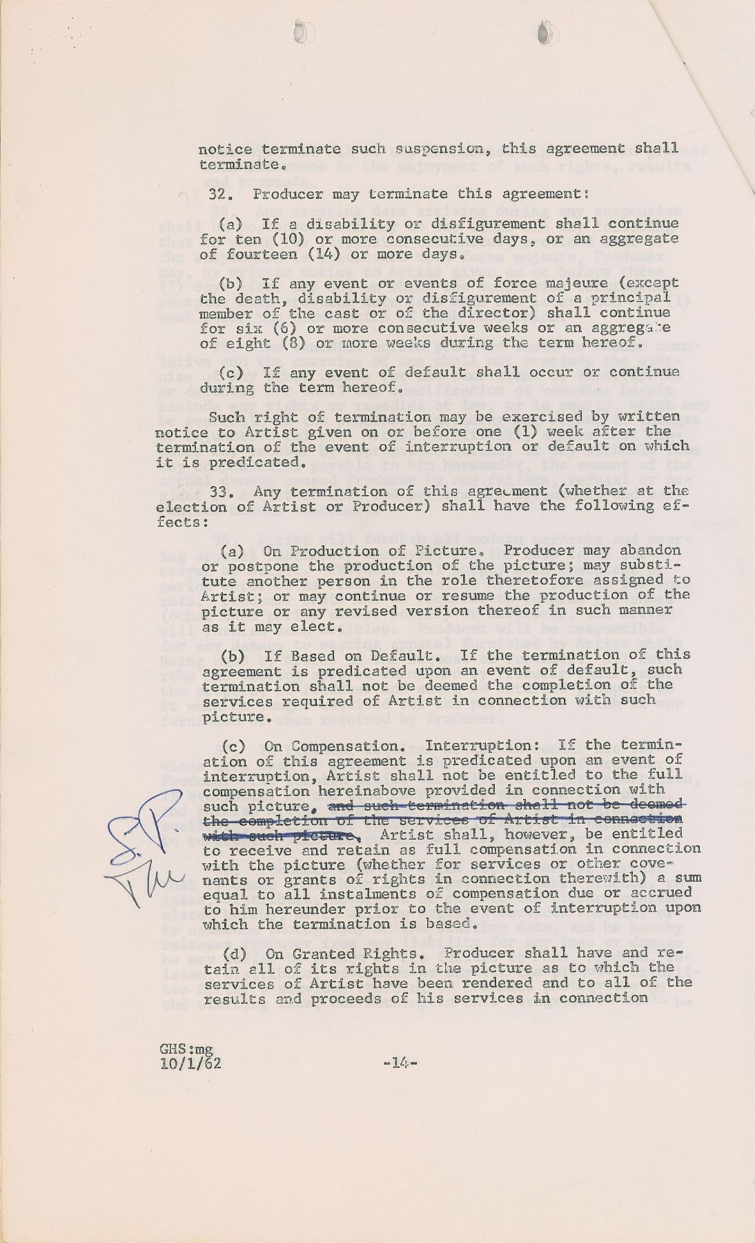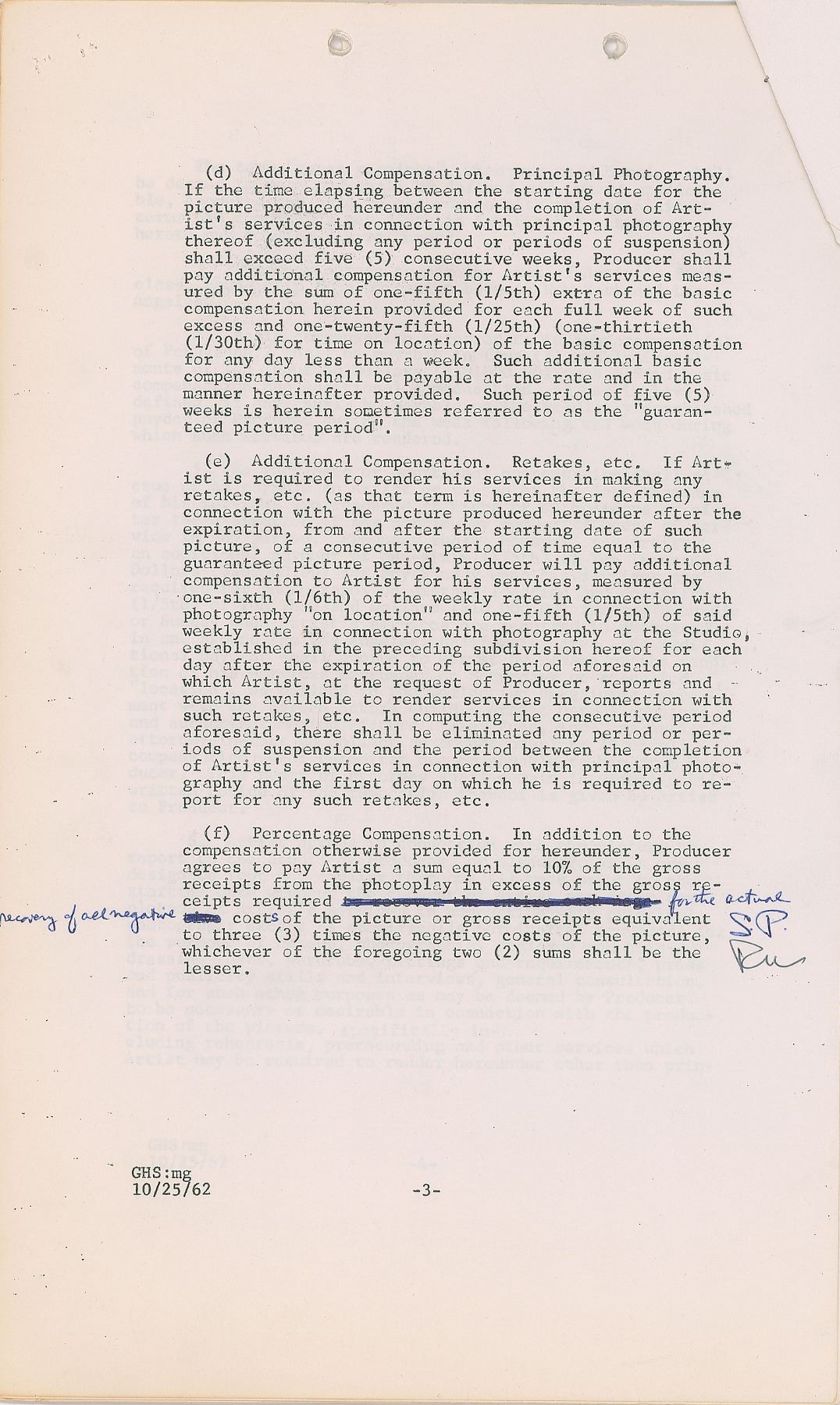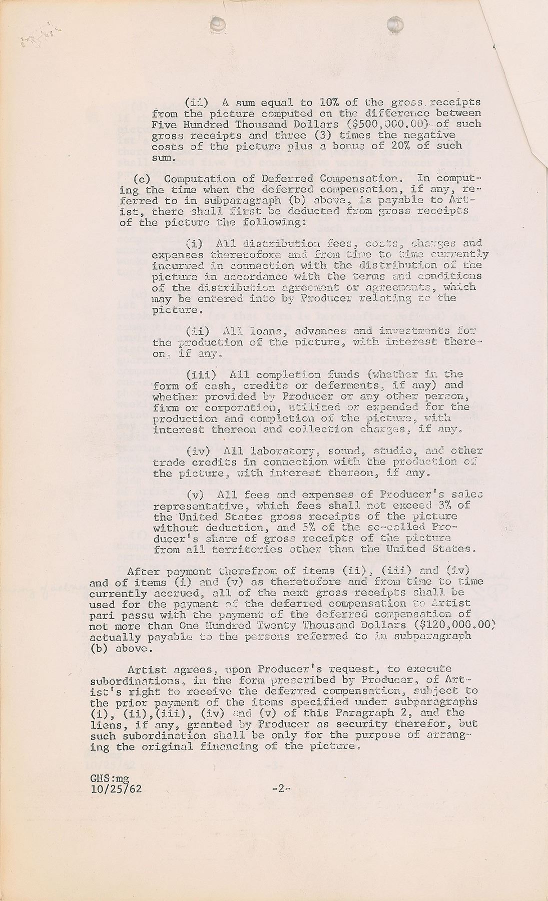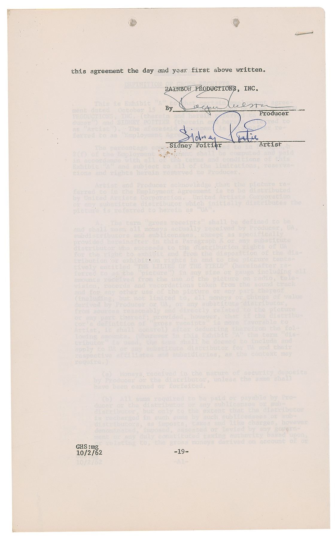 DS, nineteen pages, 8.5 x 14, October 15, 1962. Agreement defining the "gross receipts" as related to Poitier's compensation for the 1963 film The Lilies of the Field. Signed at the conclusion in ballpoint by the film's director/producer, Ralph Nelson, and by its leading man, Sidney Poitier. Also initialed by both three times throughout the document. The last page has been stapled to the front of the complete document. In fine condition. For his role as Homer Smith, an itinerant handyman who builds a chapel on a farm run by nuns, Poitier was awarded the 1964 Academy Award for Best Actor—making him the first African-American to win a Best Actor award, and the second to win any Oscar (after Hattie McDaniel's prize for Gone With the Wind). A superb piece associated with Poitier's historic role.