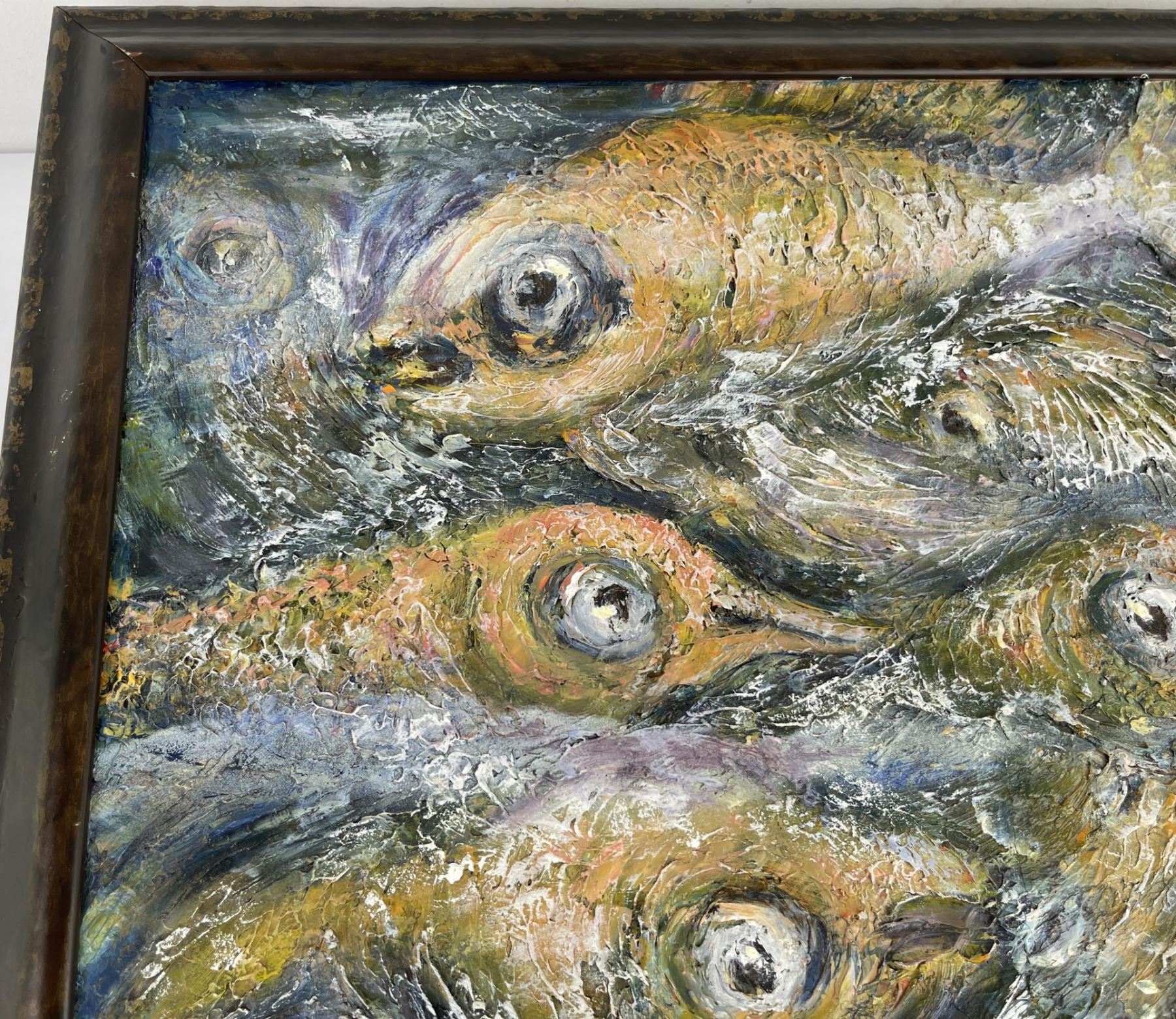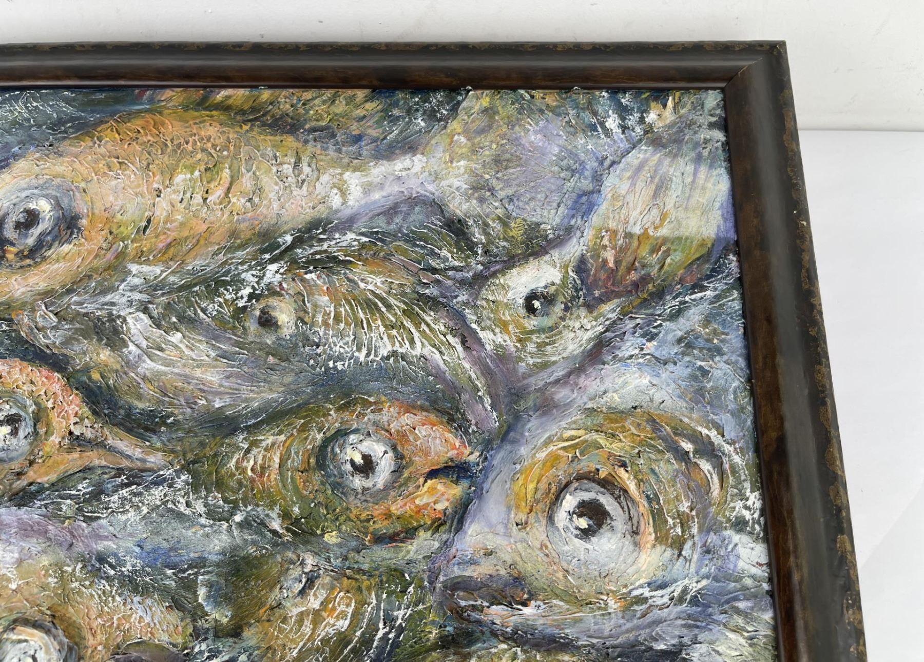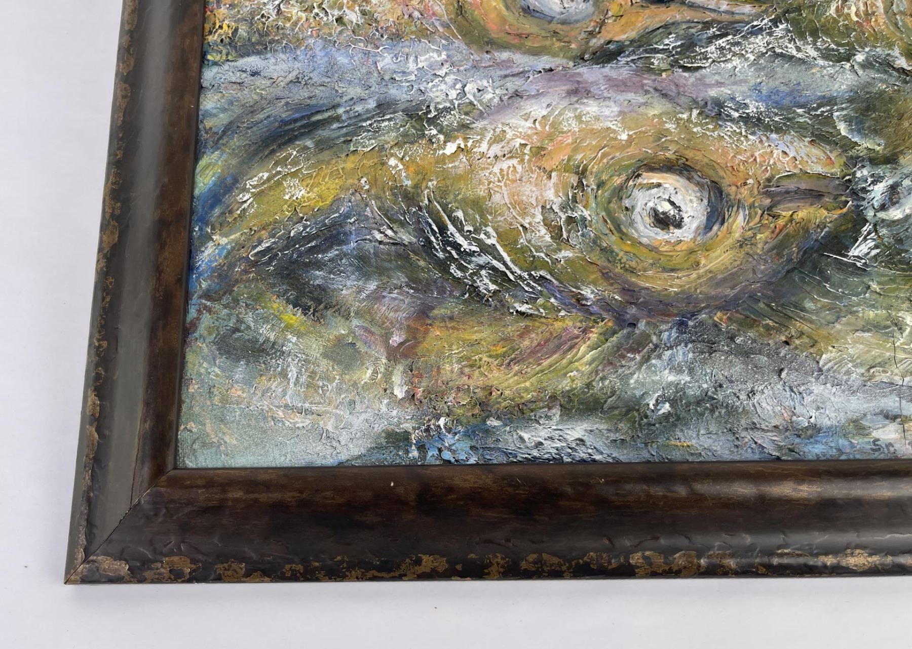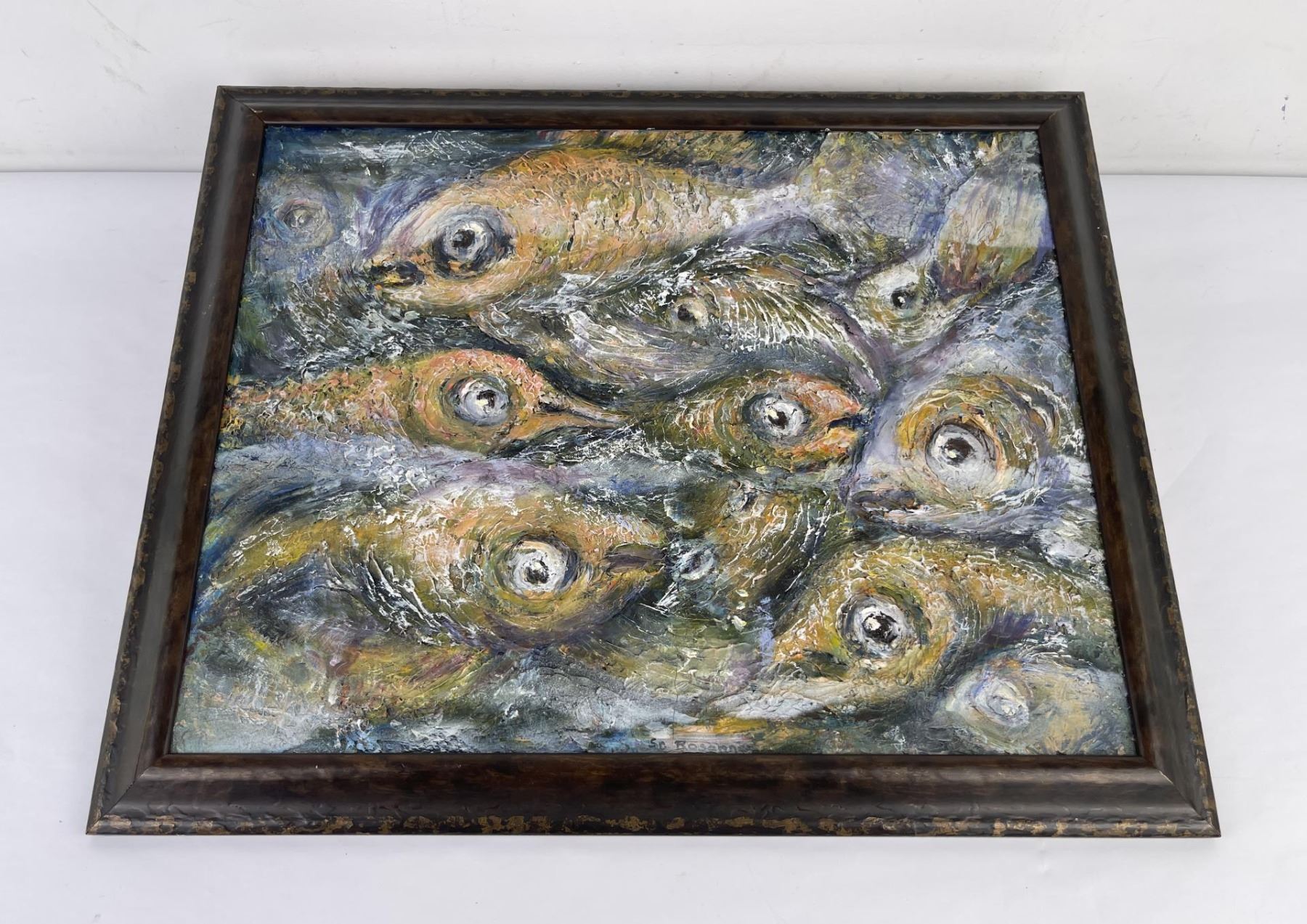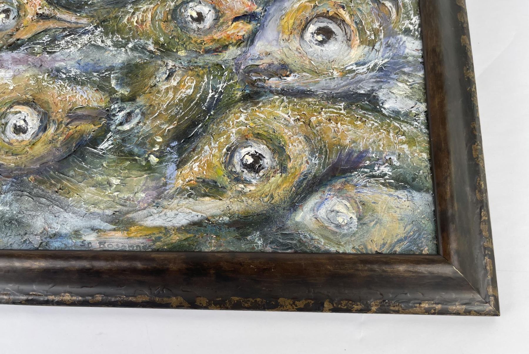 18.5" by 22.5" framed. Philadelphia artist, Sidney Rosanne was born in 1911 and started painting as a very young child. He graduated from The Pennsylvania Academy of Fine Art in Philadelphia, attended The Graphic Sketch Club and The Fleicher Art Memorial. He studied at the Tyler School of Fine Art of Temple University, The Cheltenham Center For The Arts, and The Abington Art Center. He taught private art classes for over 40 years, and, in his youth, he worked as an illustrator for the N.W. Ayer Advertising Agency in Philadelphia. His works, displayed in many private collections, include a painting purchased for the Myers Elementary School, in Melrose Park, Pennsylvania as a memorial to a young student. Through the years, he had also been commissioned to paint portraits and murals. His primary medium was oil on canvas, but his experimentation with mixed media, included paint textured with sand and gravel, and paintings on unusually textured surfaces such as masonite, wall board, wood, and decoupage using rice paper, just to name a few. This experimentation into the textural aspect of the media brought a uniqueness to his works. Painting was a way of life for him until his illness made it impossible to work, and he died at the age of 89,in the year 2000