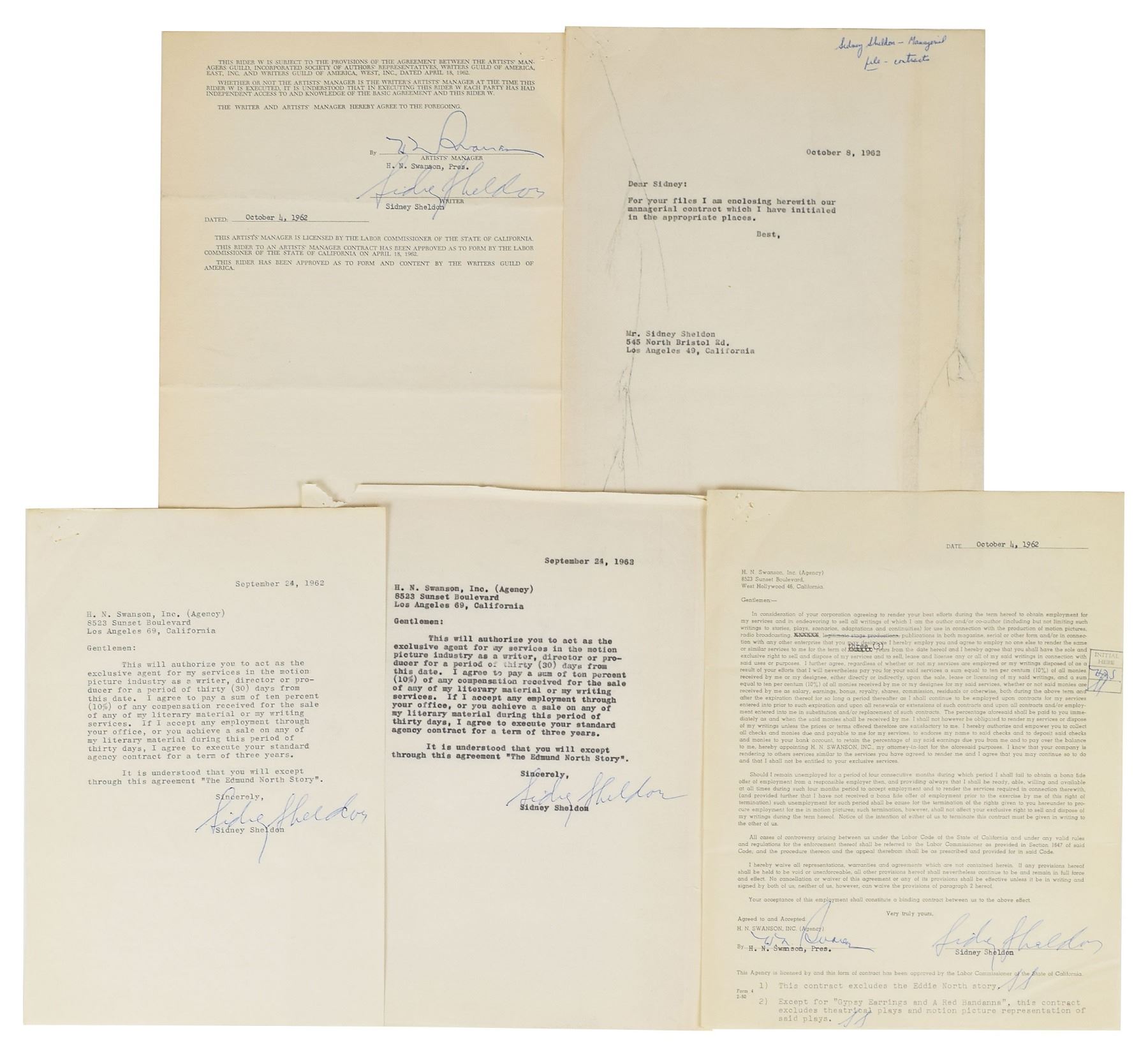 Four documents signed at the conclusion in blue ballpoint by Sheldon, including: a pair of official letters to H. N. Swanson, Inc., dated September 24, 1962, both similarly authorizing the agency to act as the “exclusive agent for my services in the motion picture industry as a writer, director or producer” for a period of 30 days, and affirming the agreed acceptance of ‘The Edmund North Story’; and an employment contract with H. N. Swanson, Inc., for a period of three years, dated October 4, 1962, with Sheldon adding his initials three times to the document, including to exclusions for “the Eddie North Story” and “Gypsy Earrings and A Red Bandana.” The latter document includes the original eight-page rider, which Sheldon has signed at the conclusion. In overall very good to fine condition.