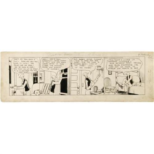 <B>Sidney Smith - The Gumps Daily Comic Strip Original Art (Chicago Tribune, 1921).</B></I> Andy Gump stars in all four panels of this whimsical episode, titled "Flat Vs. Home - Round Three." This strip has an image area of 20" x 5.5", and the art is in Excellent condition. <BR><BR><b>Shipping:</b> Flat Material, Large (<a target="_blank" href="http://www.heritageauctions.com/common/shipping.php">view shipping information</a>)