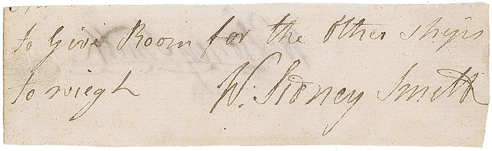 British naval officer (1764–1840) who served in the American and French revolutionary wars, best known for thwarting Napoleon’s army on numerous occasions. Ink signature, “To give room for the other ships to weight, W. Sidney Smith,” on an off-white 4 x 1.25 slip clipped from the conclusion of a letter or document. Also signed on the reverse, “W. Sidney Smith.” Light overall toning and some show-through from writing to opposing sides, otherwise fine condition.