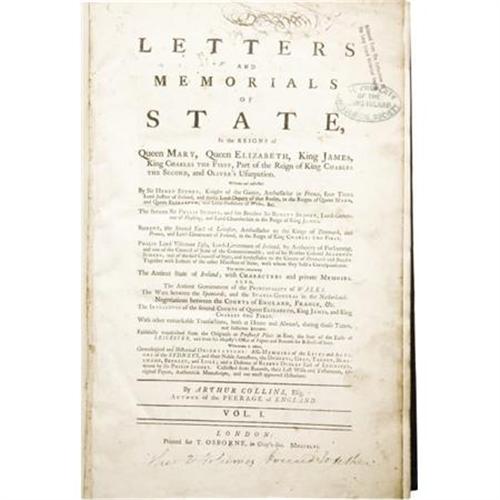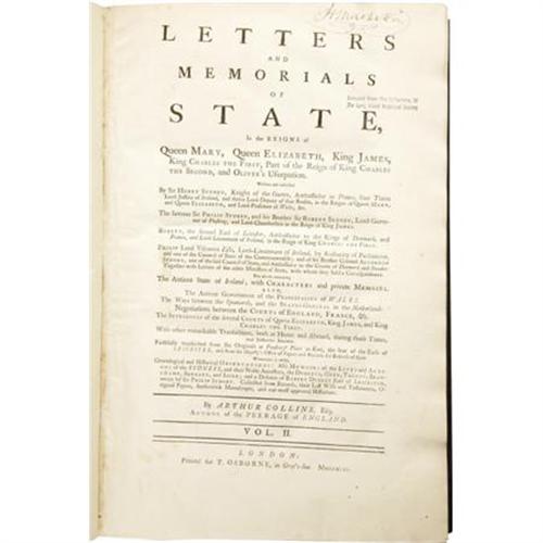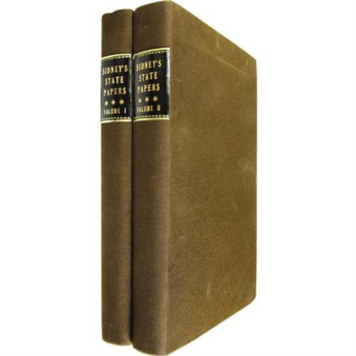 <B>Arthur Collins from Sir Henry Sidney, Sir Philip Sydney, Robert, Earl of Leicester, and Philip Lord Viscount Lisle: Two Volume Set of <I>Letters and Memorials of State</B></I></B></I><I>, in the Reigns of Queen Mary, Queen Elizabeth, King James, King Charles the First, Part of the Reign of King Charles the Second, and Oliver's Usurpation</B></I> (London: Printed for T. Osborne, 1746), two volumes, volume I: 400 pages, volume II: 733 plus Errata page, modern dark brown cloth with black leather title plates on the spine lettered and bordered in gilt (spines read "SIDNEY'S STATE PAPERS"), folio (9" x 13.5"). Volume I has been bound with <I>Memoirs of the Lives and Actions of the Sydneys,</B></I> 180 pages plus Index. The binding on the set is about fine on both volumes. Both textblocks show mild foxing and toning, there is mild damp-staining to the early part of the text of volume I & two small stamps on the volume I title page from the Long Island Historical Society, and both volumes show a previous owner's signature on the title page, else very good.<BR><BR><b>Shipping:</b> Books & Catalogs (<a target="_blank" href="http://www.heritageauctions.com/common/shipping.php">view shipping information</a>)