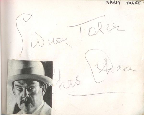 Vintage pencil double signature of ,“Sidney Toler, Charlie Chan” on an 4.5"x5" off-white album page,does have a small photo of Toler as Charlie Chan attached to bottom left which does partially cover the C in Charlie.was an American actor, playwright, and theatre director. Of primarily Scottish ancestry, he was the second non-Asian actor to play the role of Charlie Chan.