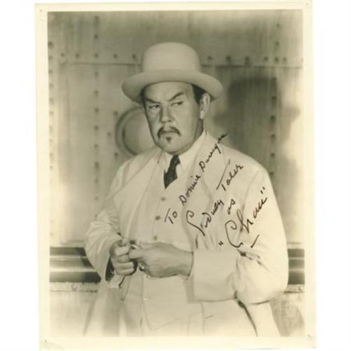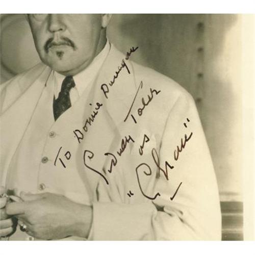 <B>Sidney Toler Signed Photo.</B></I> An original 8" x 10" matte-finish portrait of Sidney Toler as "Charlie Chan," signed in black fountain ink,"To Donnie Dunagan Sidney Toler as 'Chan.'" Missouri-born Toler played the Asian sleuth in 22 movies, beginning with 20th Century-Fox's <I>Charlie Chan in Honolulu</B></I> (1938) and ending with Monogram's <I>The Trap</B></I> (1946), released shortly before his death. In Very Fine condition pin holes in each border corner. Toler's adding "Chan" to the autograph makes it most desirable, as does his suitably inscrutable expression. <I>Accompanied by a COA from PSA/DNA.</B></I> IFrom the Donnie Dunagan Archive Q.<BR><BR><b>Shipping:</b> Flat Material, Small (<a target="_blank" href="http://www.heritageauctions.com/common/shipping.php">view shipping information</a>)