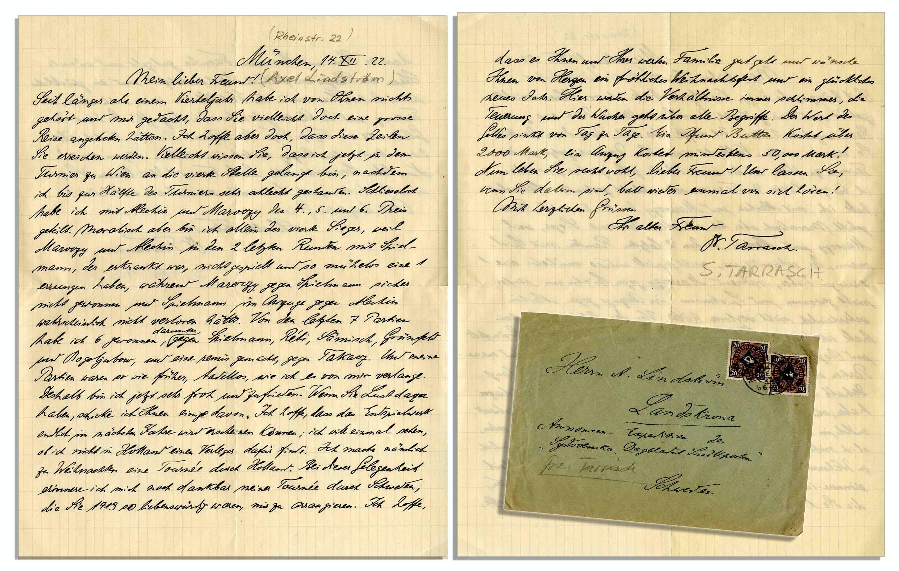German chess great Siegbert Tarrasch autograph letter signed, dated 14 December 1922. Letter in German, addressed to Swedish chess editor Axel Lindstrom, discusses Tarrasch's game in a 1922 chess tournament in Vienna with other chess greats including Russian Alexander Alekhine, Hungarian Geza Maroczy, Austrian Rudolf Spielmann and Czechoslovakian Richard Reti. 2pp. letter, front and verso, measures 8.5'' x 11'' and includes original envelope with postage intact. Nice, bold ''S. Tarrasch'' signature at close. Very good condition.