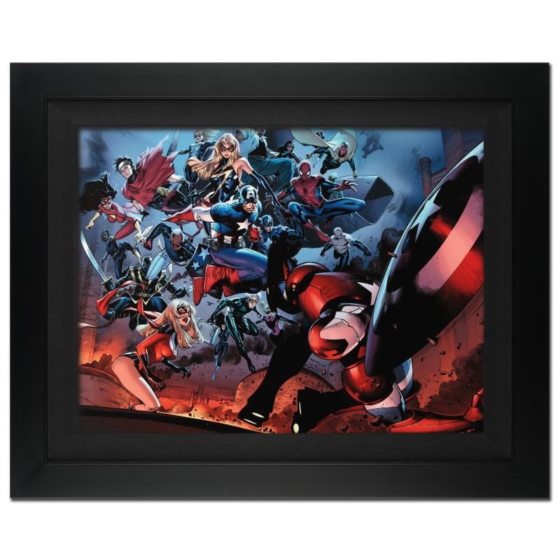 A piece of comic book history, this limited edition, from original art by Oliver Coipel, depicts Ms. Marvel, Captain America, Ronin, Wiccan, Spider Woman, Spider-Man, Iron Man, and many more. Olivier Coipel is a French comic book artist, known for his work on books such as House of M, Legion of Super-Heroes and Thor. Coipel signed an exclusive contract with Marvel Comics in January 2005. He was named in August 2005 as one of Marvel's "Young Guns," a group of artists that that included Jim Cheung, David Finch, Trevor Hairsine, Adi Granov, and Steve McNiven, which according to Marvel Editor-in-Chief Joe Quesada, exhibited the qualities that make "a future superstar penciler." "Siege #3" is an extremely limited edition giclee on canvas by Oliver Coipel presented by Marvel Comics, hand signed by the Great Stan Lee (1922-2018) and numbered out of only 4! This piece is custom framed and ready to hang. Includes Certificate of Authenticity! Measures approx. 36" x 29" (with frame), 29" x 22" (image).