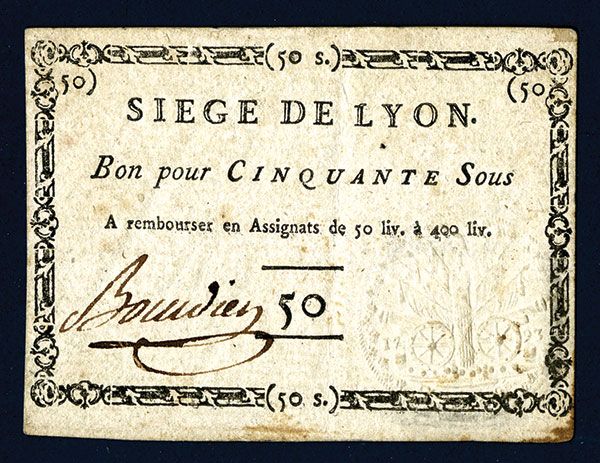 Lyon, France, ND 1793, 50 Sous, P-S302, Issued banknote, black ornamented border, 1 signature at left, uniface, Choice XF to AU condition, scarce note in high condition.
