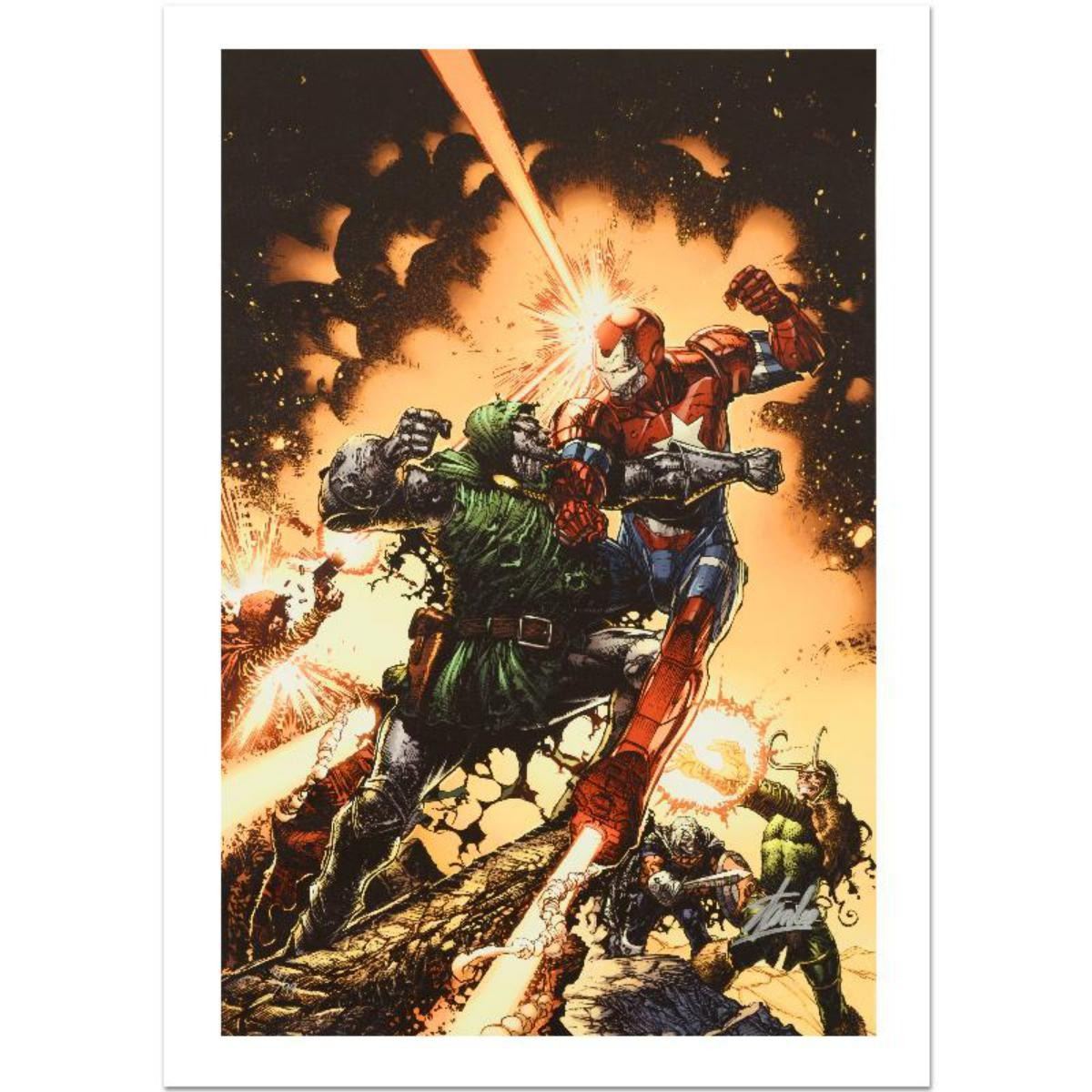 A piece of comic book history, this limited edition, from original art by David Finch, depicts an epic battle between Iron Patriot and Dr. Doom. In 2003, Finch came to Marvel Comics for a year-long arc on Ultimate X-Men, after which he began work on The Avengers and thereafter The New Avengers. He has also worked on such titles as Captain America, Spider-Man and the Hulk. "Siege: The Cabal #1" is a limited edition giclee on canvas by David Finch presented by Marvel Comics, numbered and hand signed by the Great Stan Lee (1922-2018)! Includes Certificate of Authenticity! Measures approx. 18" x 27" (image). Reference #: 186888.